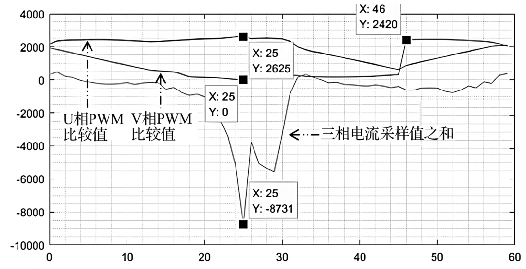 可以看到,第25个数据点处U相上桥全开(U相PWM比较值达到2625),与之对应的三相电流采样值之和远远偏离预期值0,达到-8731。在第25个数据点及其附近,由于U相上桥导通时间过长,导致这一段时间内的采样数据偏差都比较大,进而使三相电流采样值之和明显偏离预期。