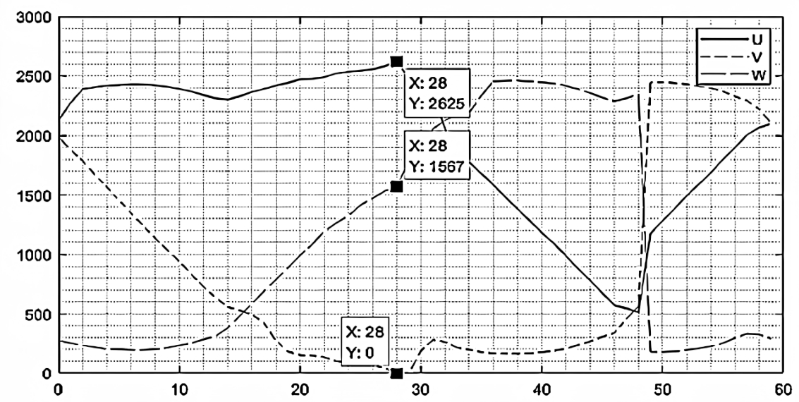 下面列举一个因输出占空比过大而导致采样异常的例子。如图1-2所示,横轴为数据对应序号,纵轴为数据值,3条曲线从上到下分别为U相PWM比较值、V相PWM比较值、三相电流采样值之和。在此例中,当PWM输出占空比为100%时,对应的比较值为2625。