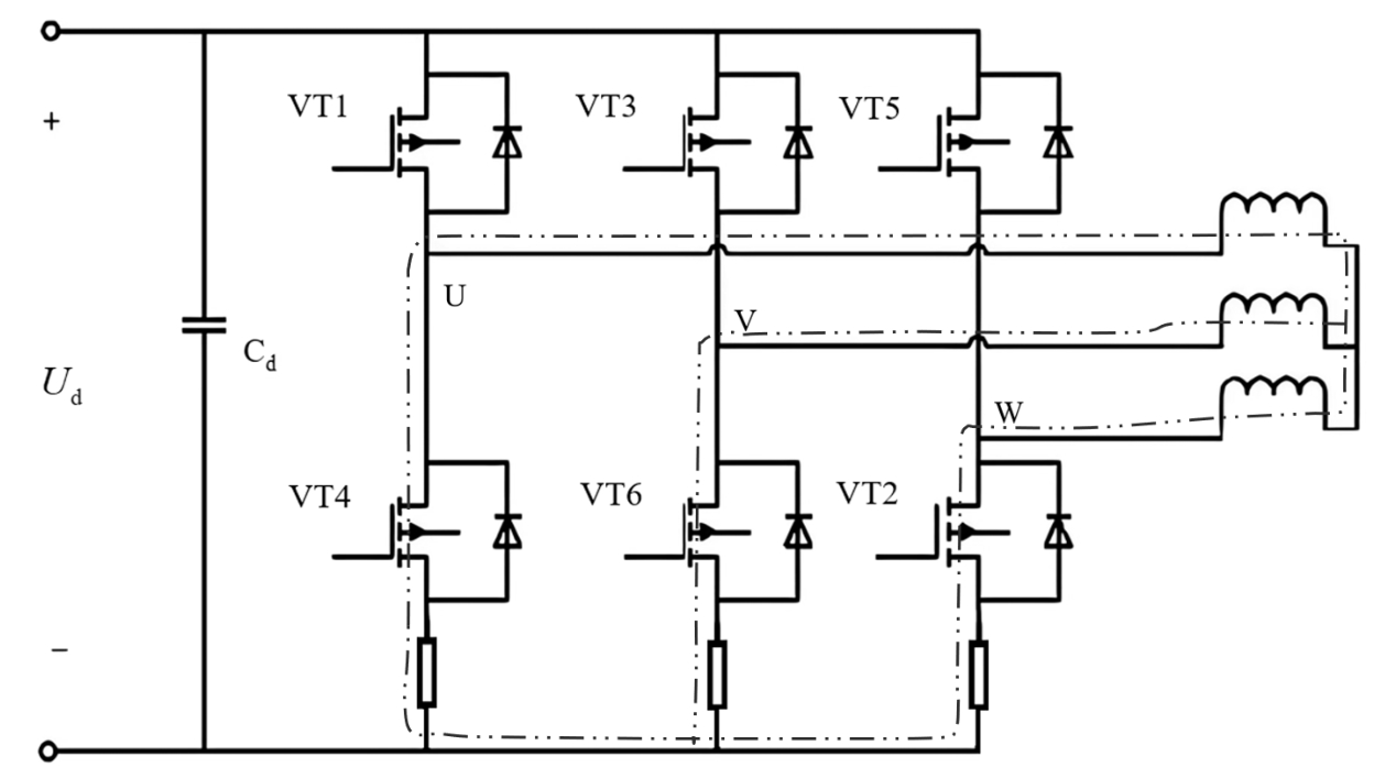 那么,有没有这样一种开关状态:无论对应电机电流方向如何,电流都流经电流采样电阻呢?答案是肯定的,在三相下桥导通时,电机三相绕组经过下桥开关管和电流采样电阻短接在一起,此时,无论电机电流方向如何,电流都流经对应的电流采样电阻,如图1-1所示。其中,VT1~VT6为MOS管,C d 为母线电容, U d 为母线电压,U、V、W表示三相桥臂,分别连接电机U、V、W的三相绕组。