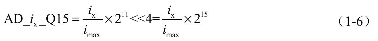 可以看到,此时的AD采样值AD_ i x _Q15是以最大电流 i max 为基值的标幺化数据,并且是以Q15格式表示的。如果选择 i max 作为基值建立标幺值系统,那么电流采样值经过去除零点漂移、增益校正等处理后即可使用。相对而言,这样处理的运算量最小,在一些控制器与电机“绑定”使用的场合应用特别广泛。对于类似变频器的应用,控制器所匹配的电机不是固定的,控制器容量和电机功率也可能存在一定的差距。这时一般会使用电机额定电流作为基值进行标幺化,如此一来,可以清晰地知道当前电流相对于电机额定电流的大小,对电流进行控制或限制都非常方便。在这种情形下,还需要对电流采样值做一些运算,如变换其基值及Q格式。