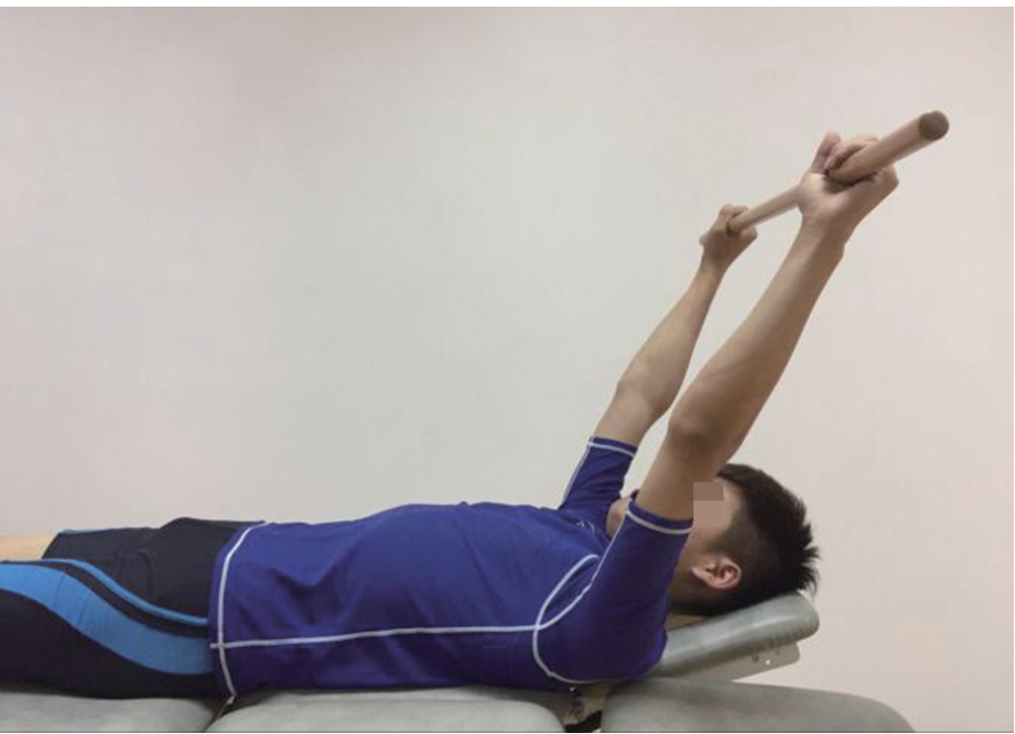 3.体操棒 可利用体操棒进行训练。两手分别抓握体操棒两端,利用健侧上肢的运动带动患者上肢完成各种助力运动,扩大关节活动范围(图6-2-13)。