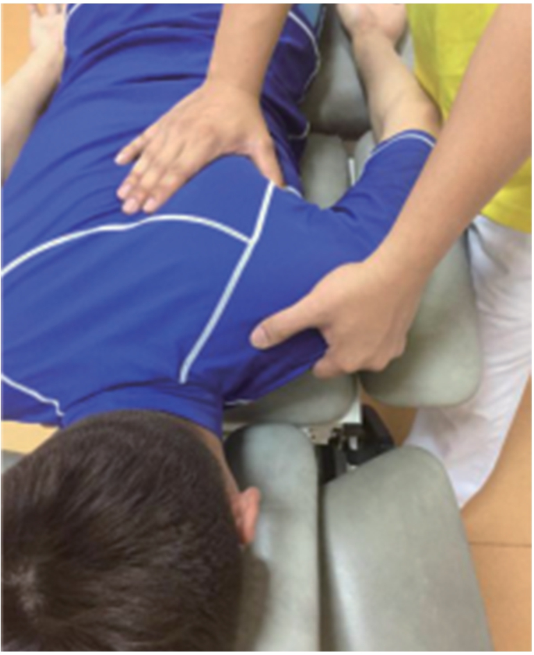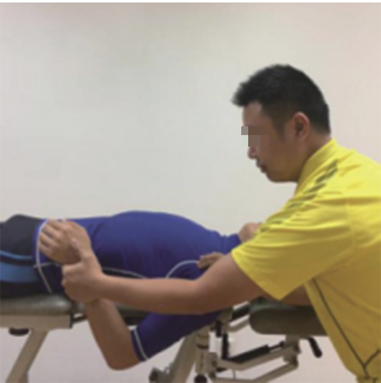 (2)治疗师体位:治疗师一手稳定胸椎,一手放于大腿下。