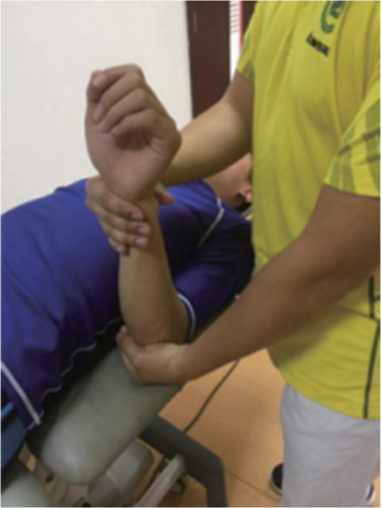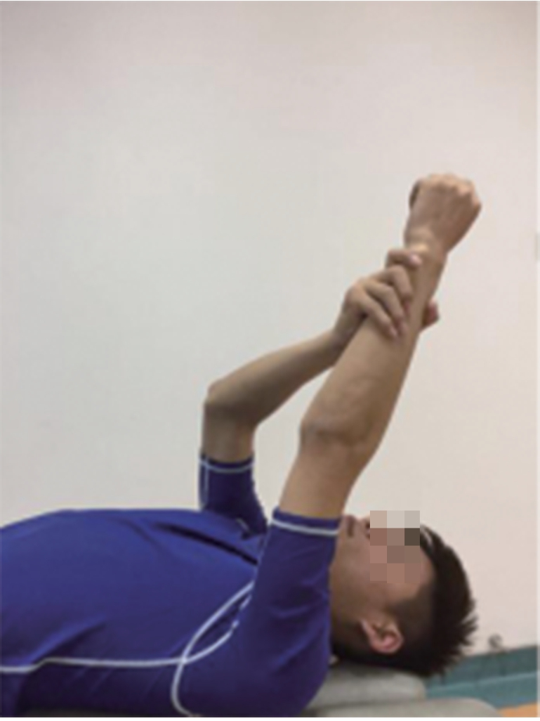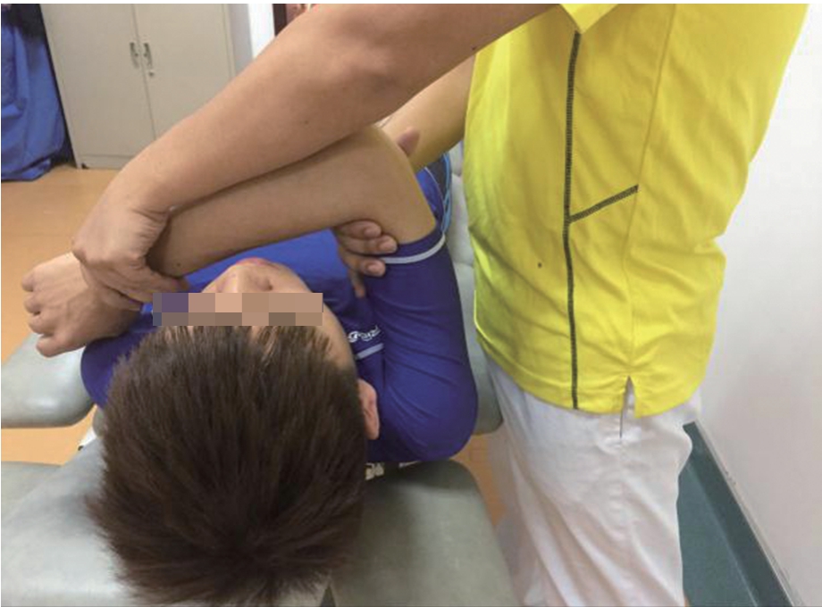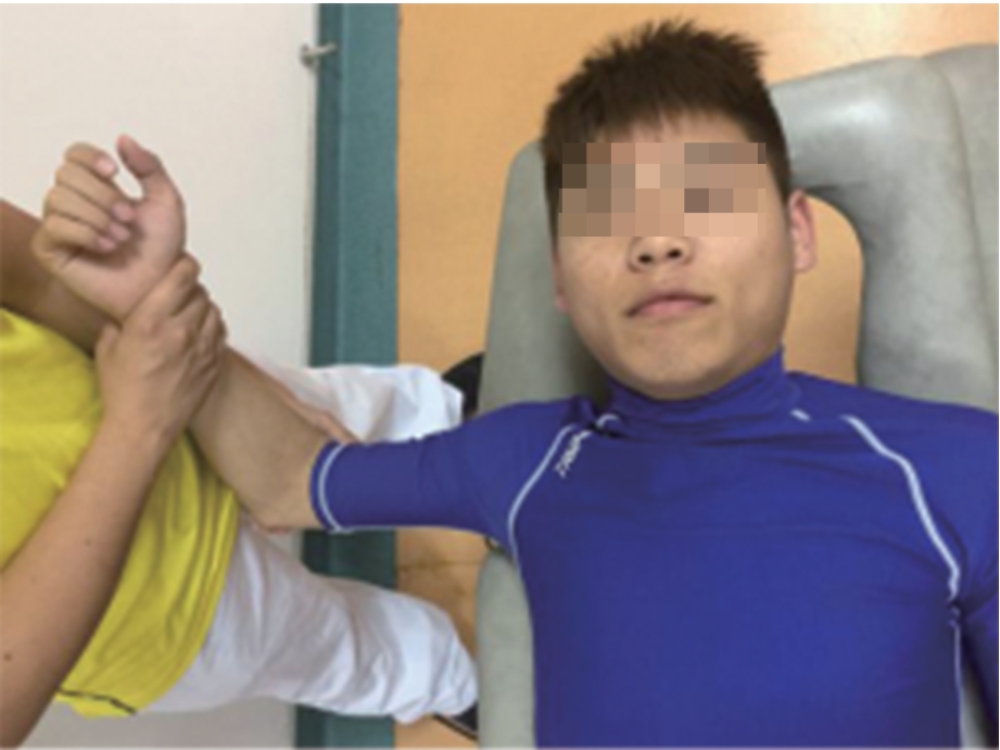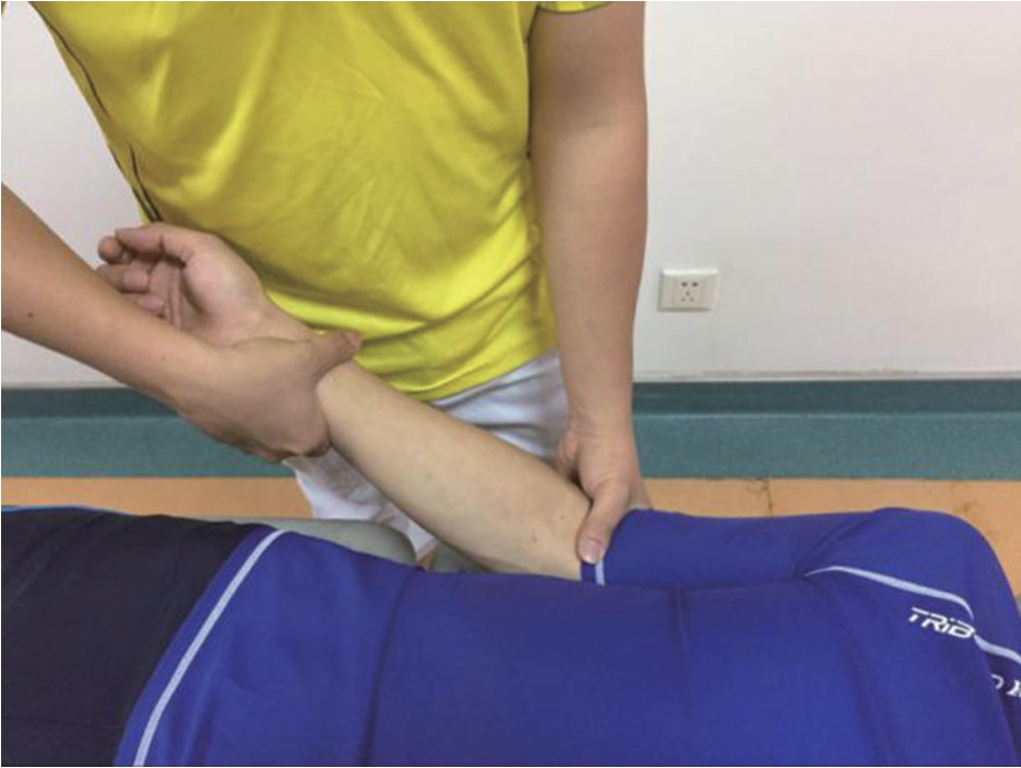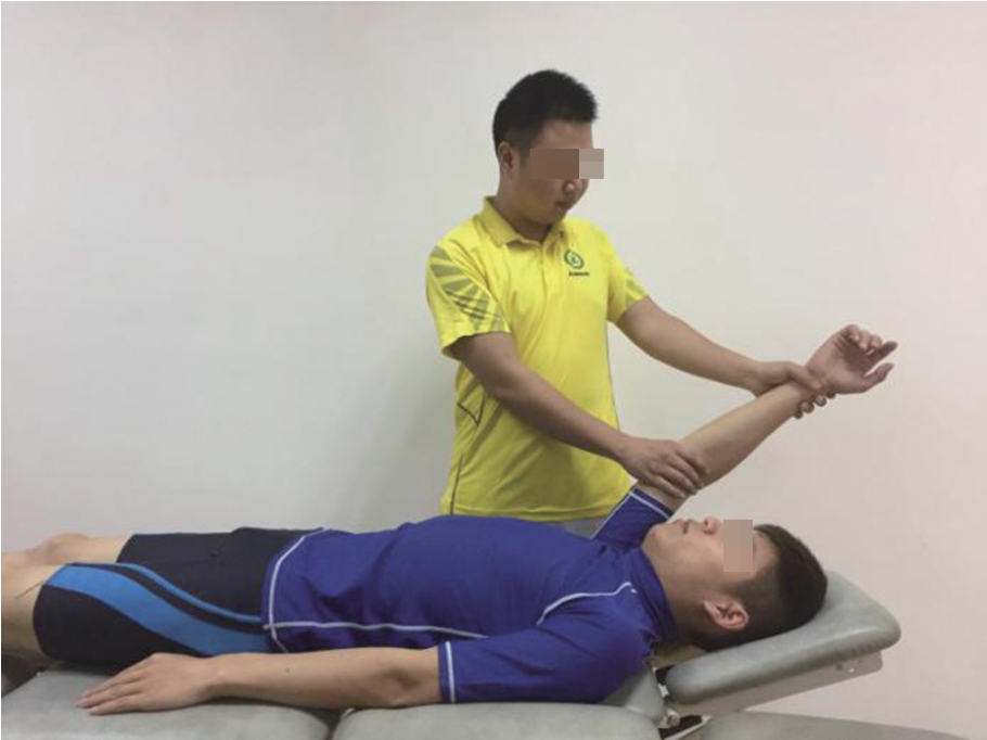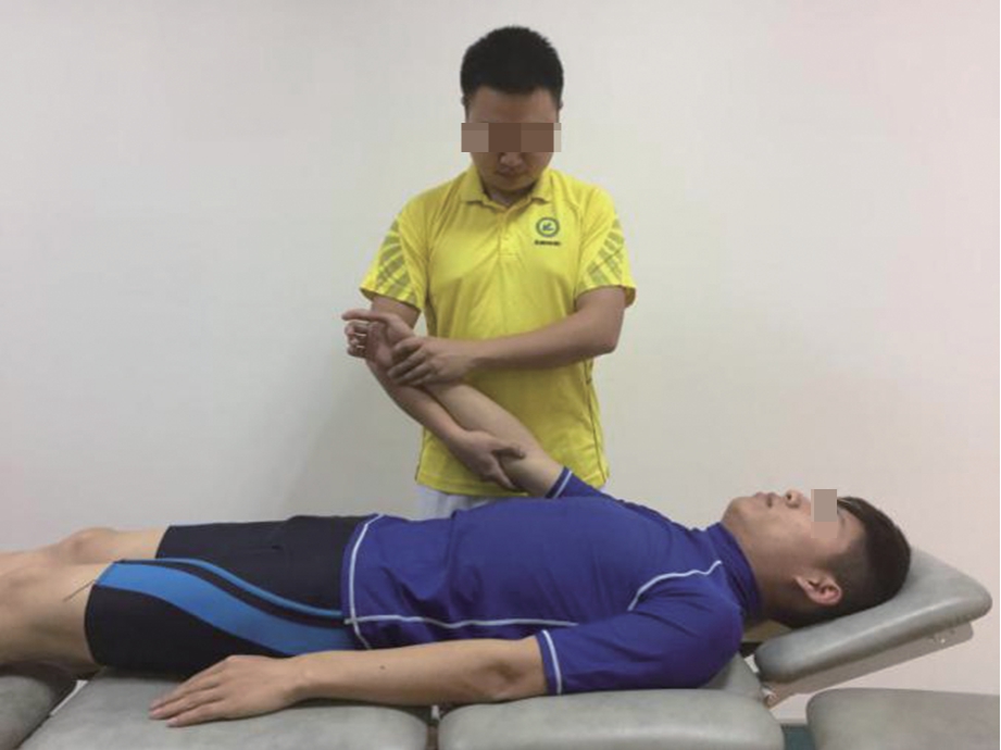 (2)治疗师体位:治疗师一手握住患者的腕关节,另一手握住肱骨远端。