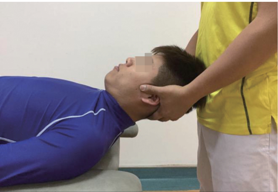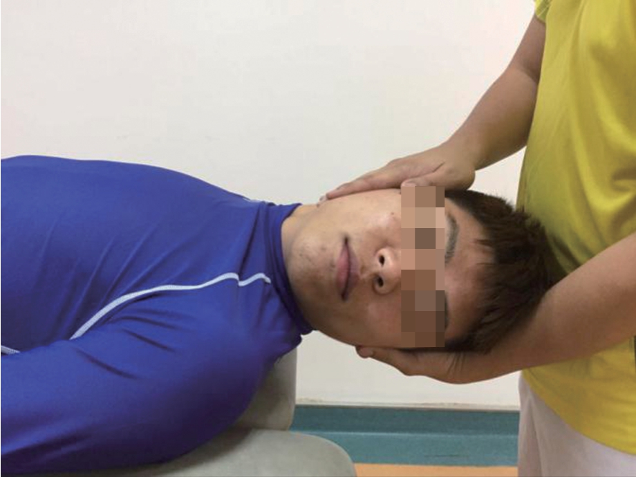 (2)治疗师体位:治疗师站在治疗床床头,将双手拖住患者枕部并给予稳定支撑。