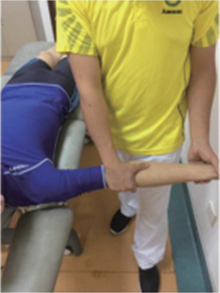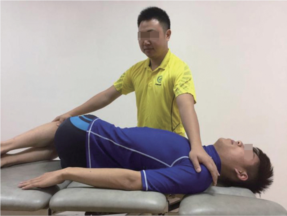 (2)治疗师体位:一手放于对侧肩以稳定肩关节,一手放于对侧膝关节外侧。