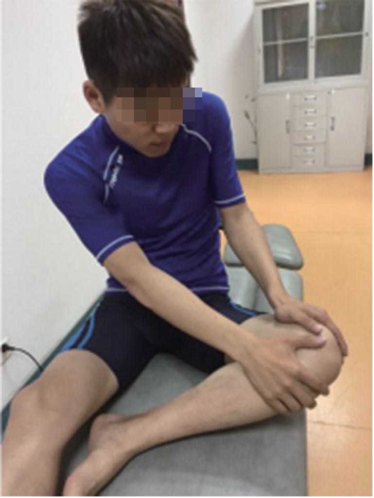 3.髋关节的外展、外旋的结合 患者坐于治疗床上,患处屈髋屈膝,足置于治疗床上,让患者将膝向外侧(治疗床的方向)推,用上肢作为助力(图6-3-7)。