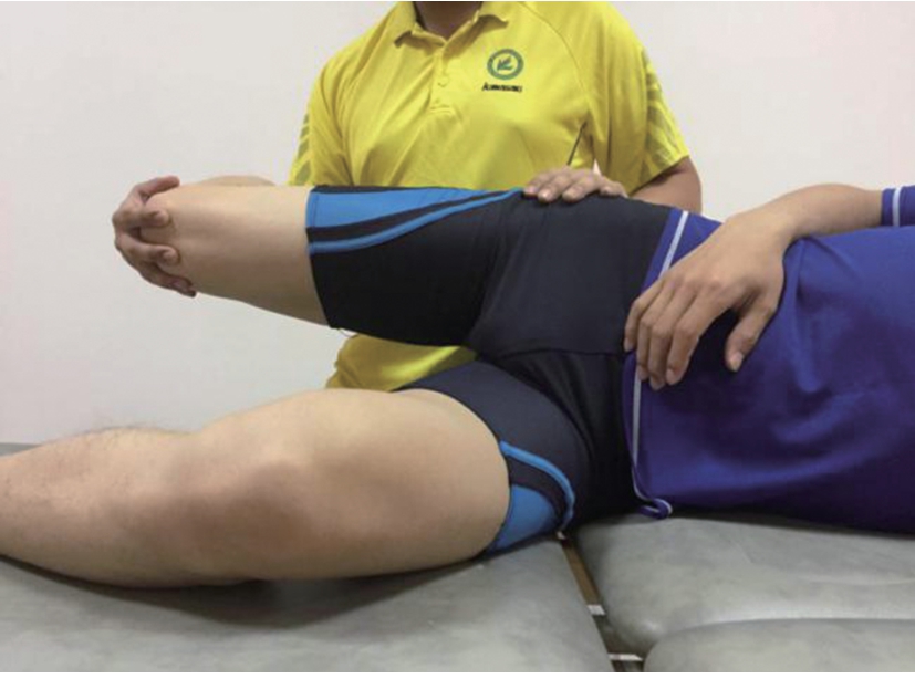 (2)治疗师体位:治疗师一手固定骨盆,一手位于股骨远端近膝关节处。
