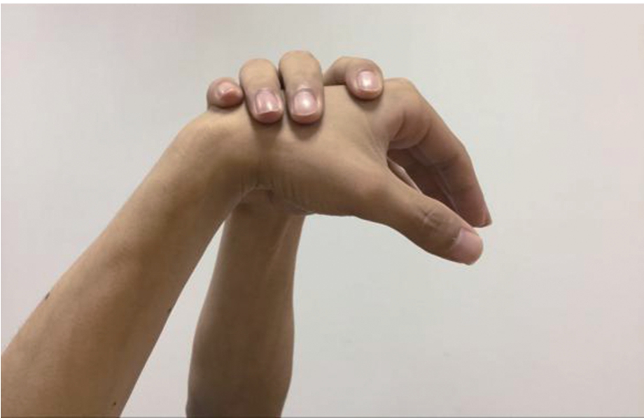 (2)治疗师体位:治疗师一手固定肘关节,另一手握住患者手腕。