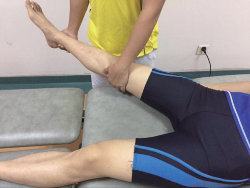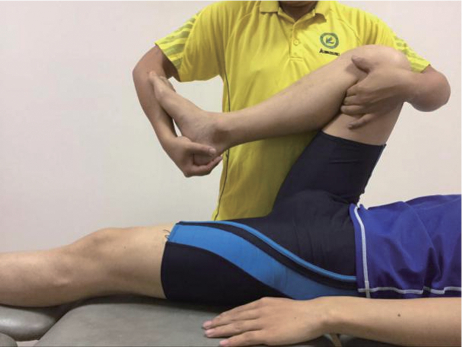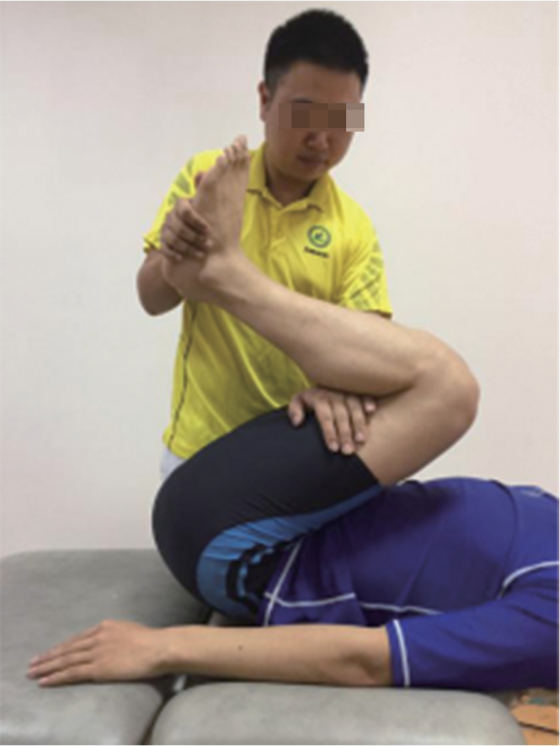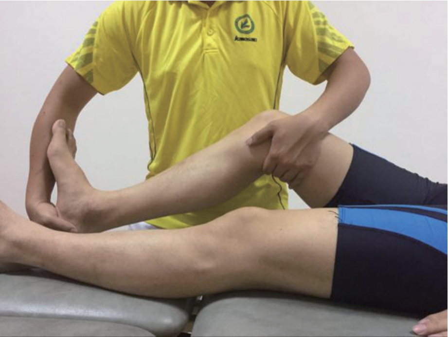 (2)治疗师体位:治疗师一手放于患者大腿远端后侧,一手放于足底。