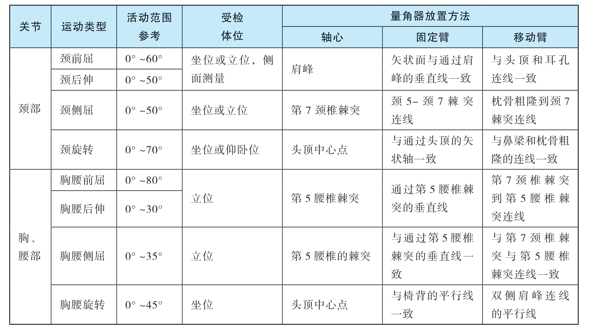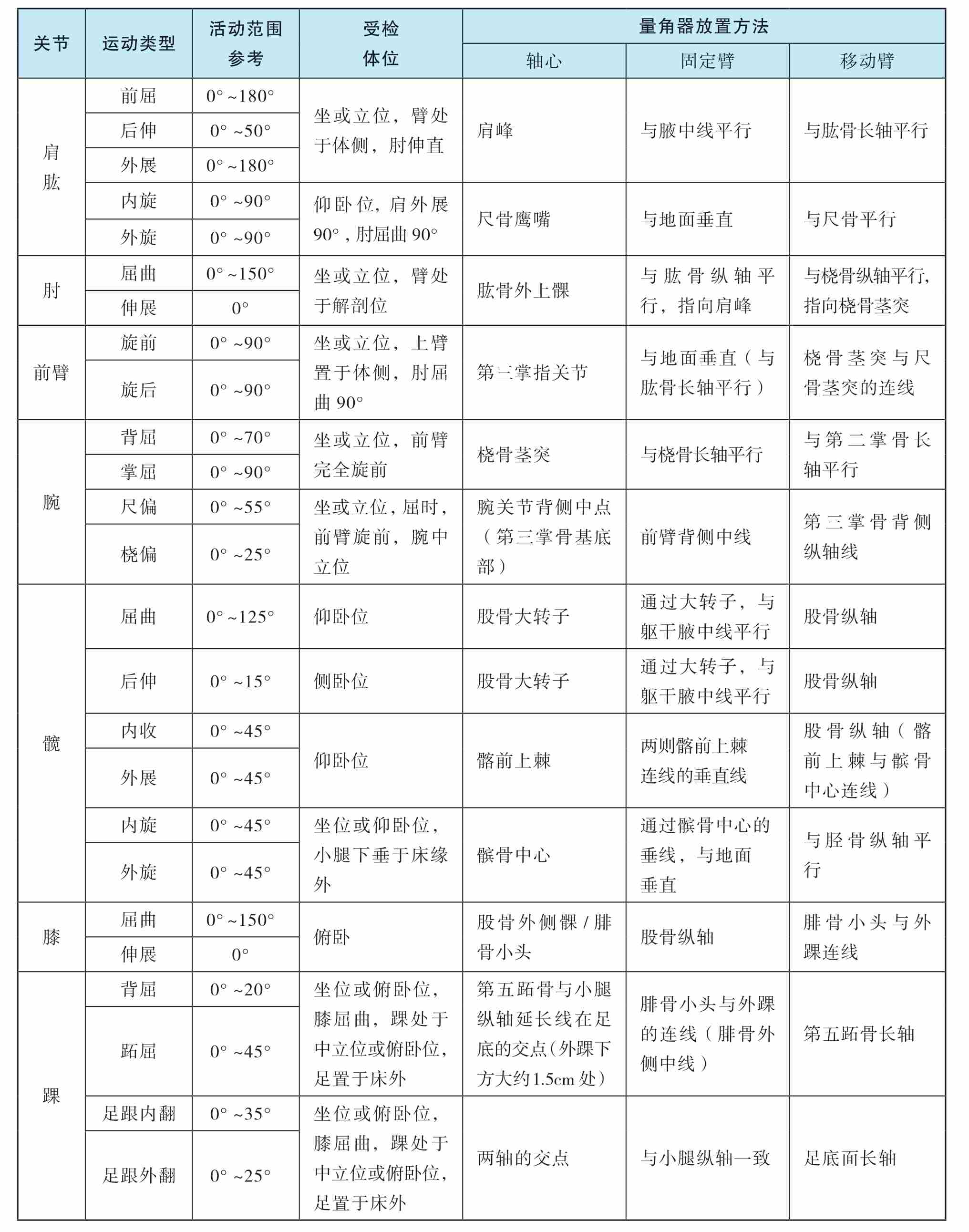 关节活动范围是指关节运动时所通过的轨迹,主要沿着三个相互垂直的运动轴进行,包括前屈-后伸、内收-外展、内旋-外旋等。例如,肩、髋关节具有3个活动轴,即绕额状轴做屈伸运动,绕矢状轴做外展和内收运动,绕垂直轴做内旋和外旋运动。肘关节包括两个关节:肱尺关节和尺桡关节,具有两个活动轴,一个是绕额状轴做屈伸运动,另一个是绕垂直轴做前臂的旋前和旋后运动。正常各关节的屈伸或旋转均有一定的角度范围,此范围就是关节的活动度;各关节都有其正常活动范围,也就是关节活动度的正常值。这些正常值根据个体、性别、年龄、职业、人种、运动史而有所不同。
