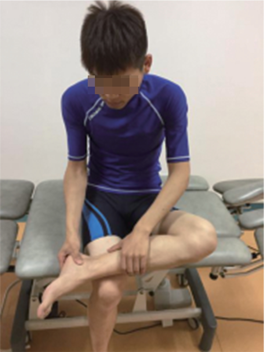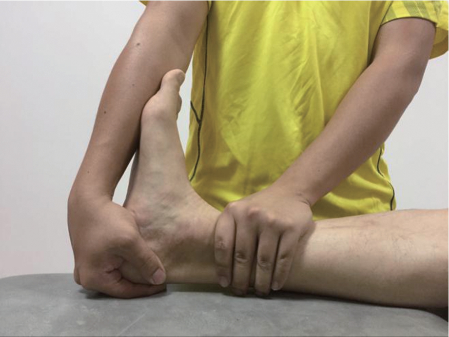 (2)治疗师体位:治疗师一手固定小腿,一手于关节处拇指在内、其余手指在外握住足跟。