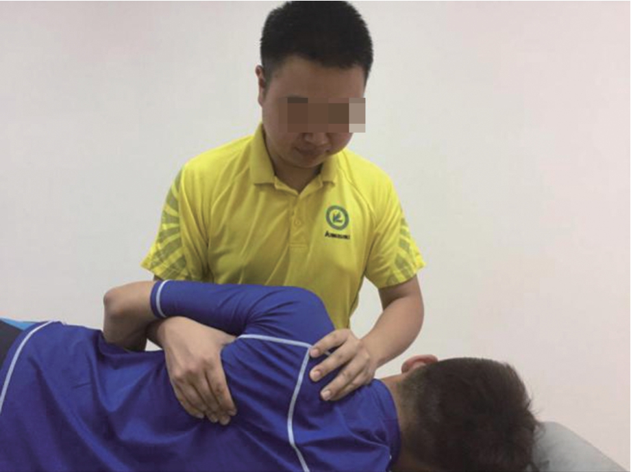 (2)治疗师体位:治疗师一手固定患者肩胛的肩峰,另一手固定肩胛下角。