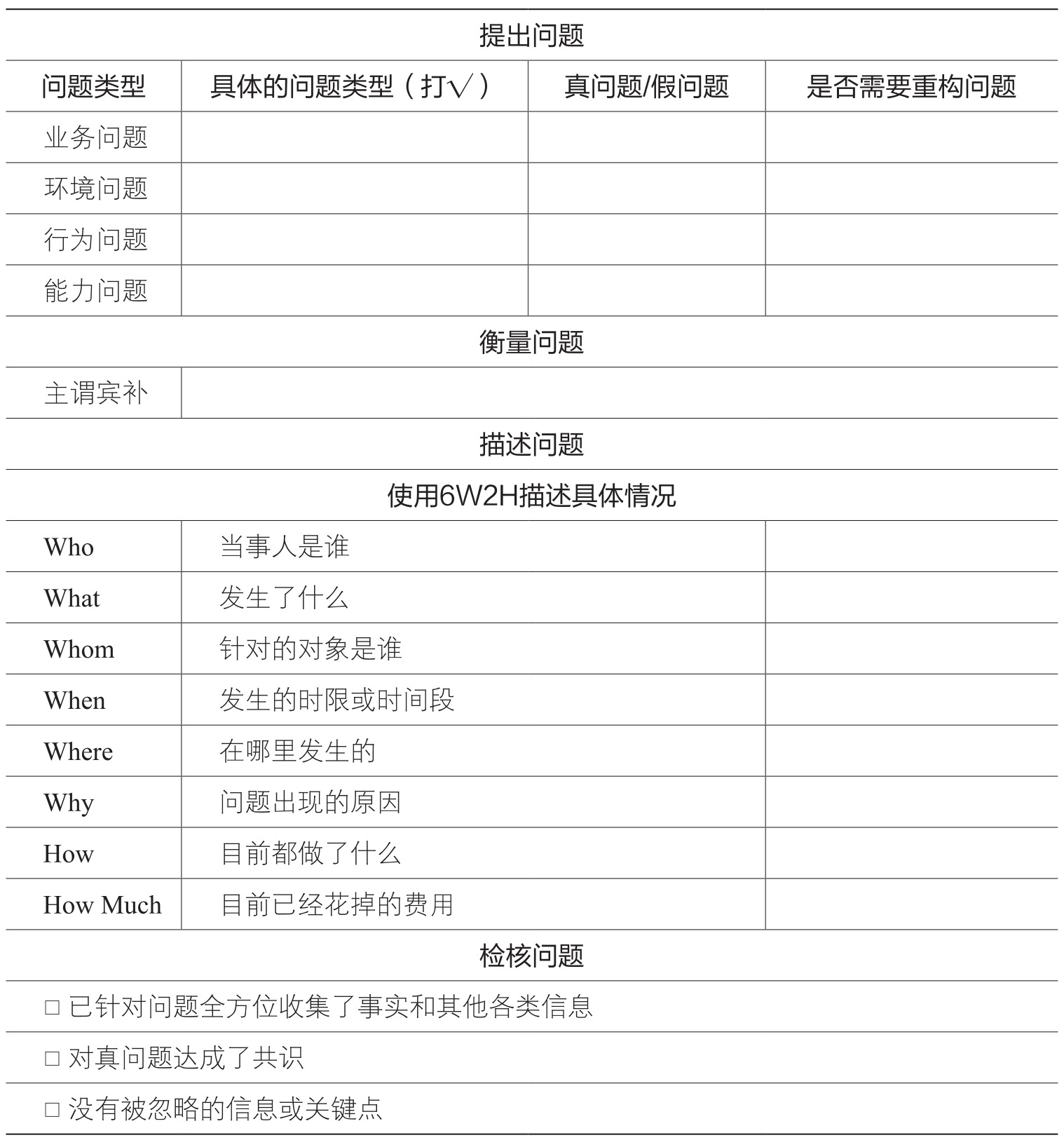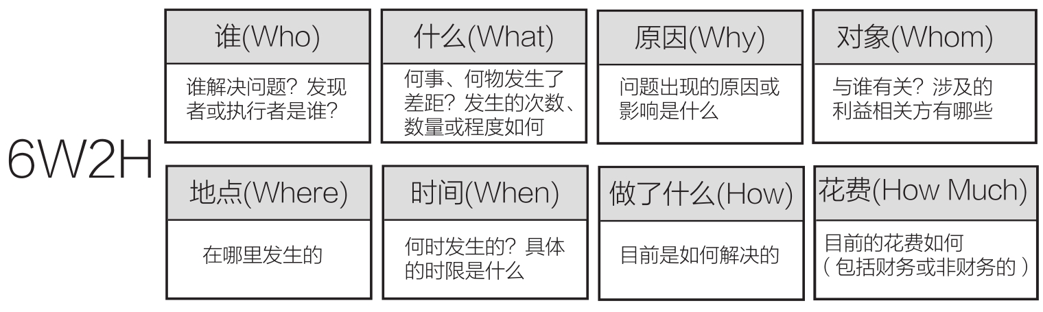 将问题目标化之后,还需要进一步对问题的具体情况进行描述,以帮助大家理解所提出的问题。通常使用6W2H对提出的问题进行具体描述,以使所有人对该问题的现状达成共识,消除信息层面的障碍,如图1-7所示。