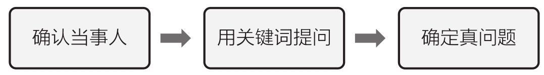 • 用关键词提问:从当事人的语言中提取相对客观的词语,然后使用当事人的原话进行提问,以使双方的对话更加自然、不刻意。通过使用关键词进行提问,可以确定双方陈述的内容是否清楚、一致,避免双方有不同的理解,从而为确定真问题创造条件。