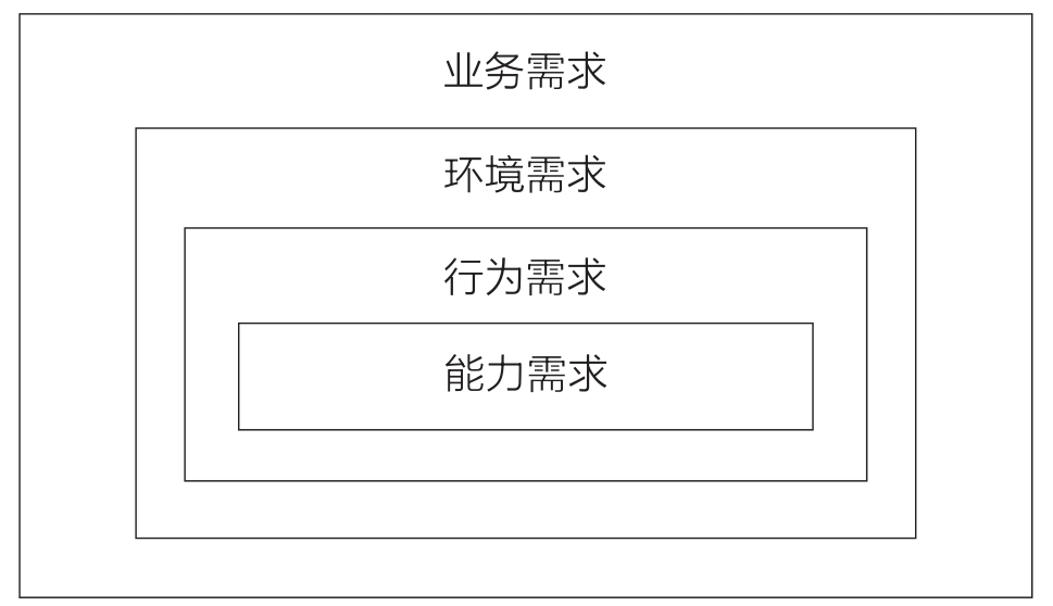 在《绩效咨询(第3版)》一书中,作者提到组织中常常面临各种期望,从而产生4类需求,包括业务需求、环境需求、行为需求和能力需求,如图1-6所示。