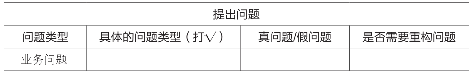 通过甄别问题类型,选择合适的问题框架,运用“定问题”三步曲,可以高效地确定真问题。表1-5是确定问题表,提供了定问题的应用工具。
