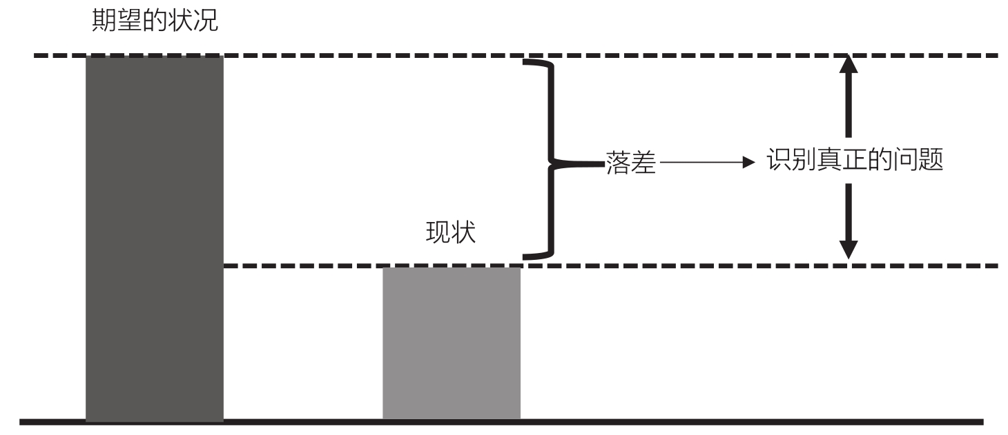 光识别出问题还不够,问题的复杂性导致有些问题即使解决了,也无法得到真正有价值的结果。定问题的本质是在不同落差中去伪存真,识别出真问题,如图1-1所示。