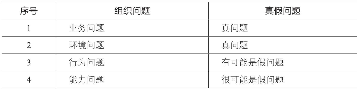 初步判断了问题类型之后,可以通过如表1-2所示的识别真伪问题清单初步判断组织提出的问题是真问题还是假问题。