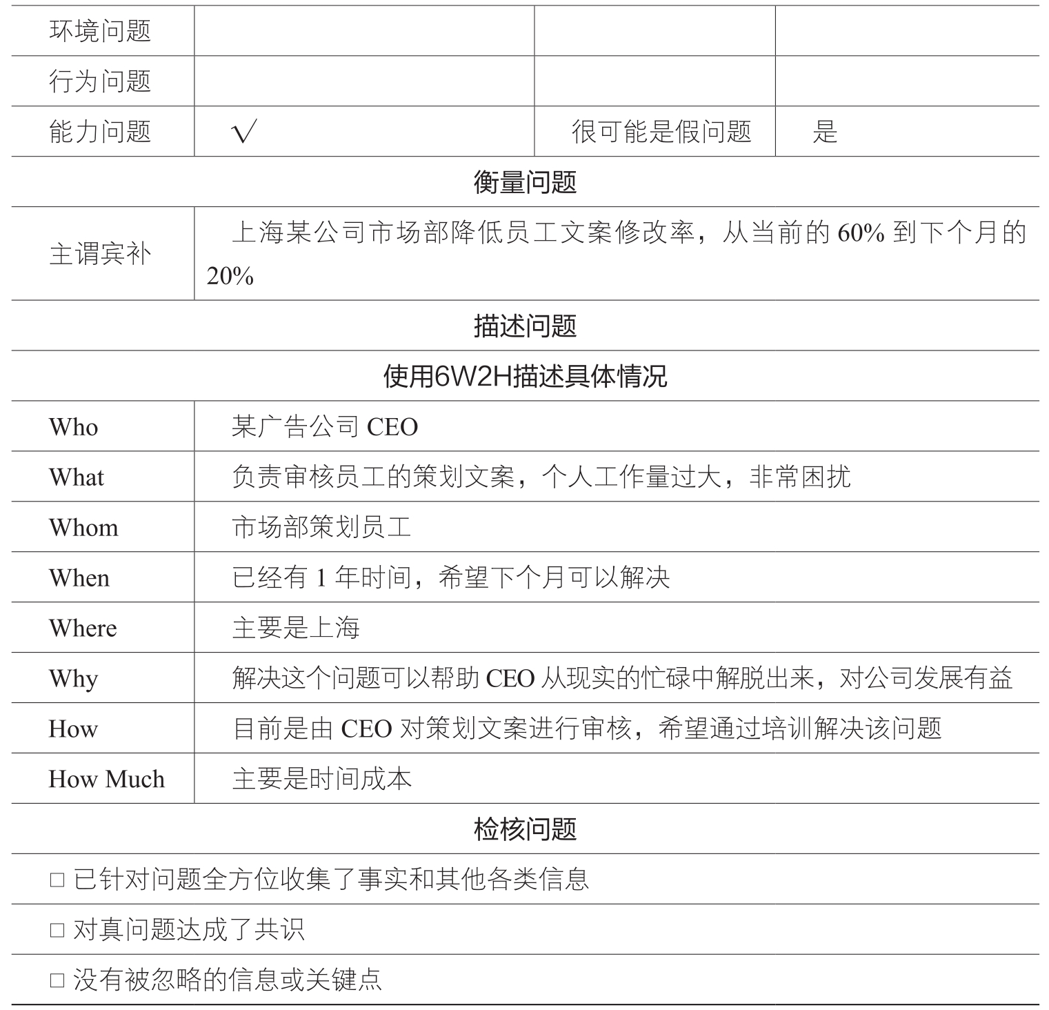 我们曾经遇到过一个广告公司的CEO,她经常抱怨员工工作态度有问题。具体情况是,公司根据客户要求提供策划文案,但员工经常达不到要求。更让人无奈的是,员工还经常加班,却得不到她的认可。员工在将策划文案提交给客户之前会先让她审核,经她确认后再发给客户。这样做的好处是,经过她审核的策划文案被客户要求修改的概率比较小,不超过10%,而未经过她审核的文案被客户要求修改的概率超过60%。这就引发了她的困扰:每天工作像打仗一样,既要审核员工完成的策划文案,又要兼顾公司的管理工作。她希望我们为员工组织一次如何有效撰写策划文案的课程,减少她的工作量,同时实现策划方案更少被修改的目的。她的需求包含一项能力需求(有效撰写策划文案)和一项行为需求(减少CEO的工作量和实现更少的修改),本质上已涉及解决方案了(提出用培训解决问题),而不是提出真问题。根据表1-2,我们知道这个需求可能是一个假需求,需要重新确认真问题。于是我们与她进行了沟通,以确定真问题。