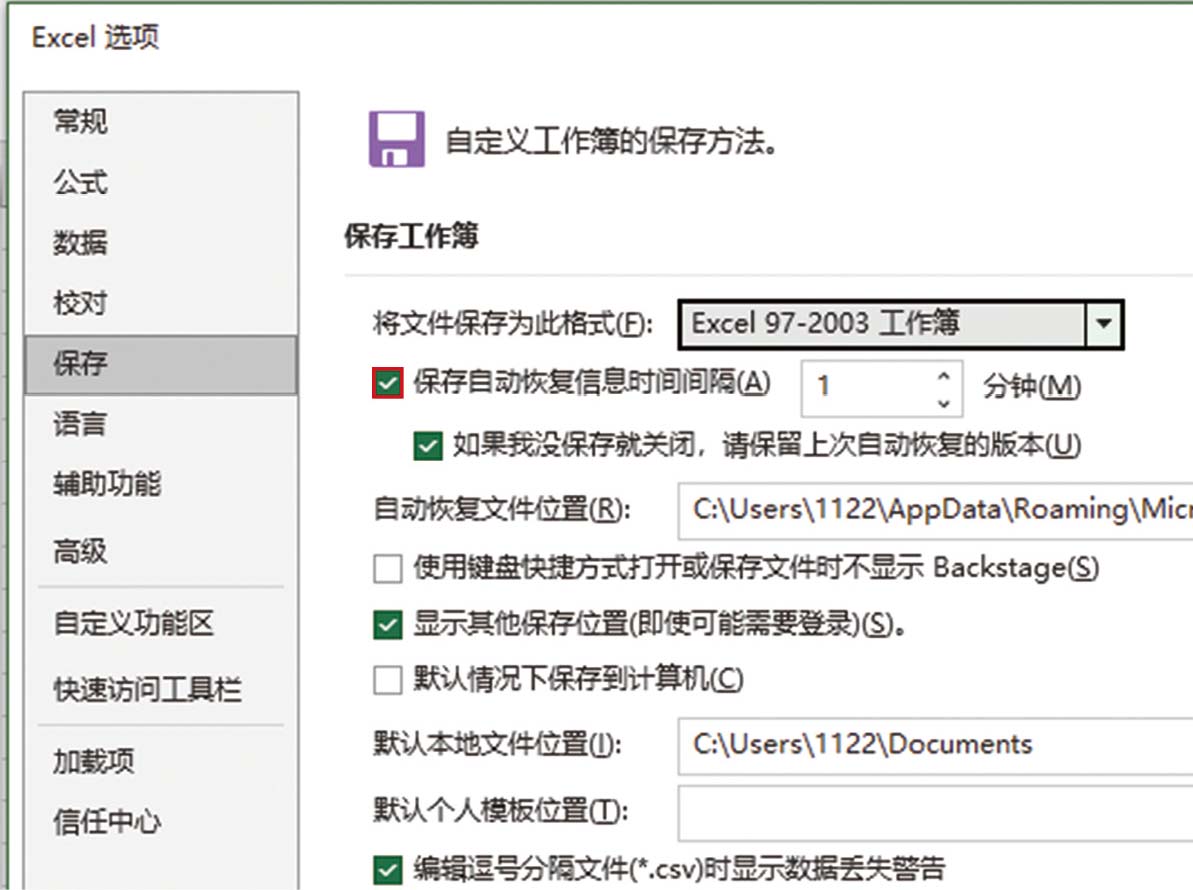 → 在【保存工作簿】中勾选“保存自动恢复信息时间间隔”