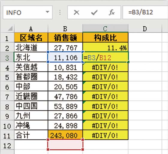 被除数引用了正确的单元格(B3),除数本应引用B11中的数值,但却引用了单元格B12的数值。就是说,指定除数时出现了偏差。