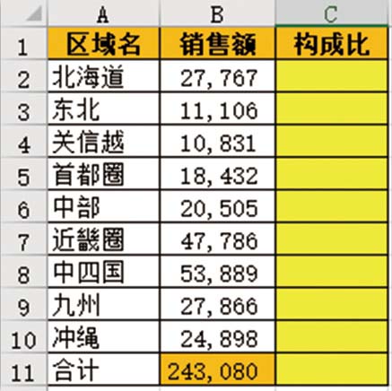 有时候,我们需要将公式复制到其他单元格中。如果事先没有掌握相关知识,就会浪费一些不必要的时间。例如,下图是不同地区的分公司的销售额一览表,其中,处理“构成比”一栏时,需要输入正确的公式。