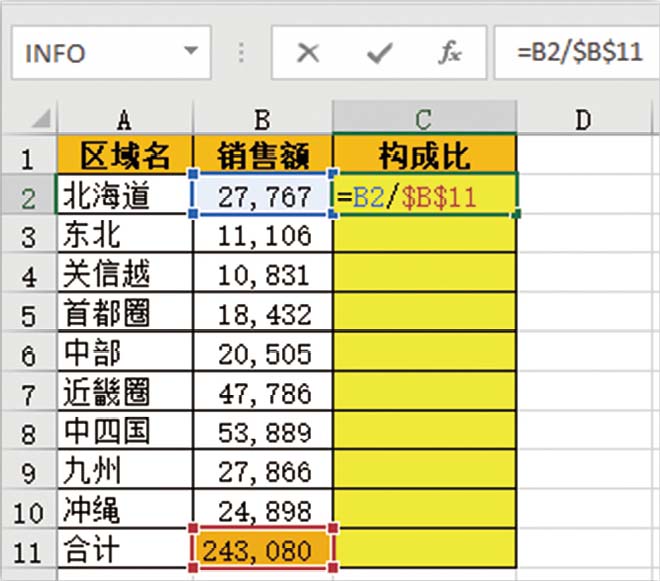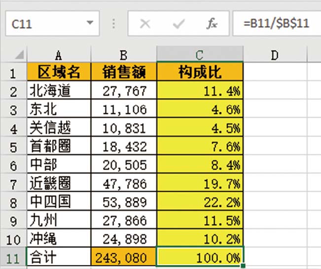 各分公司的“构成比”,是将各个分公司销售额除以全公司的销售额计算得出的。因此,首先请在C2中输入“=B2/B11”。