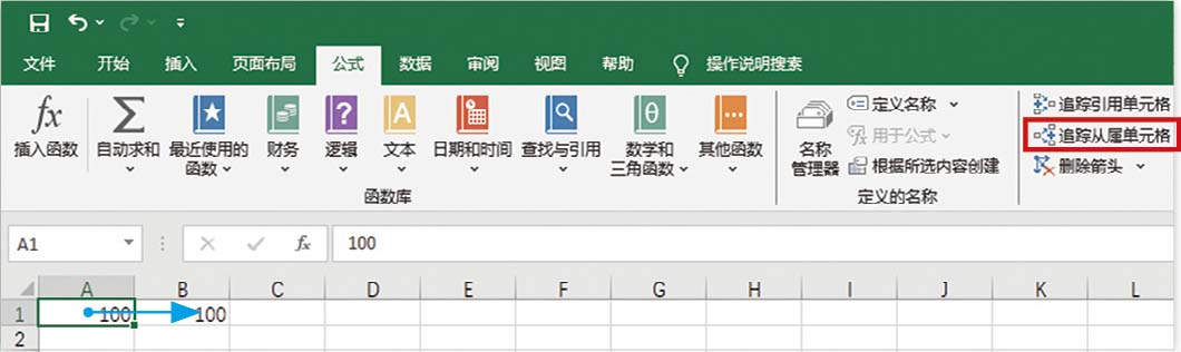 反过来,如选择A1后点击“追踪从属单元格”,会出现下图中的箭头。