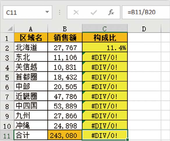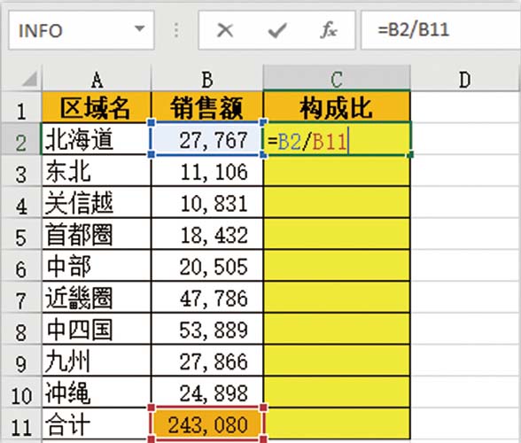 各分公司的“构成比”,是将各个分公司销售额除以全公司的销售额计算得出的。因此,首先请在C2中输入“=B2/B11”。