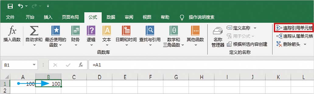 关于这一点,看到Excel界面的“追踪引用单元格”功能就明白了。图标上的箭头指向“对现在择取的单元格数值产生影响的单元格”。例如,选择B1后,在“公式”选项卡中点击“追踪引用单元格”,会出现图中的箭头。