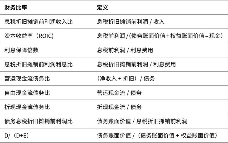 评级机构给出的评级主要基于公开信息,但由公司提供给评级机构的非公开信息在评级过程中也会起一定作用。公司债券的等级在很大程度上取决于衡量公司偿债能力以及产生稳定可预测现金流的能力的财务比率。财务比率非常多,表2.1总结了衡量违约风险的一些关键比率。