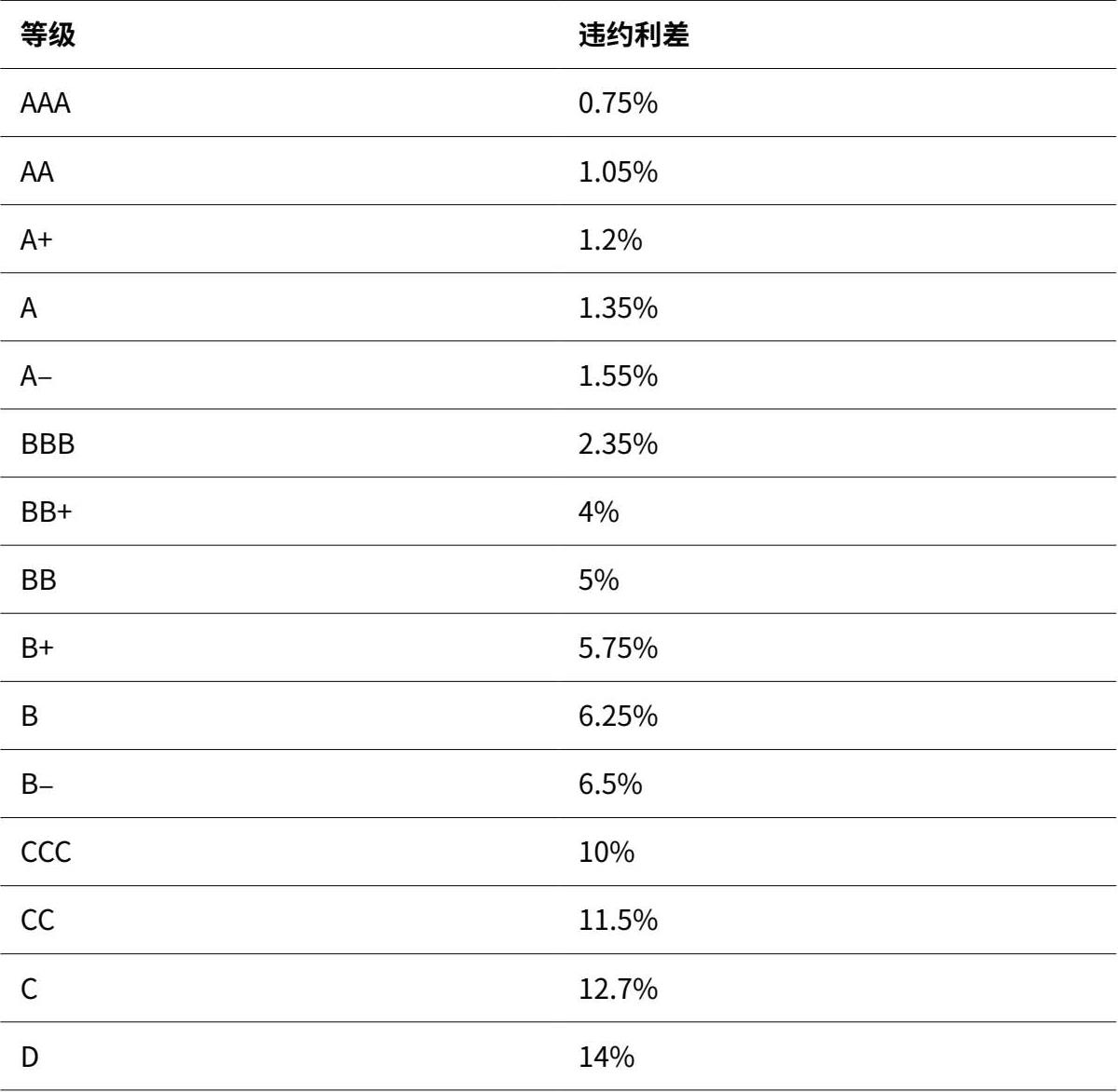 标准普尔公司的AAA级或穆迪公司的Aaa级是赋予公司的最高信用等级,代表公司的违约风险最低。随着违约风险的提高,公司的信用等级逐渐下降,直到降到表示违约公司的D级。信用等级被标准普尔公司评为BBB(穆迪为Baa)级及以上的被归为投资级,表明评级机构认为投资这些公司发行的债券面临的违约风险相对较小。