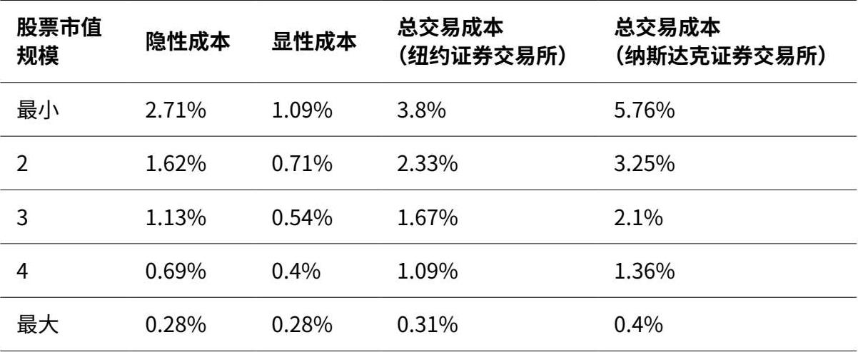 从表5.3中我们可以看到,股票市值最小的公司的总倒手交易成本比股票市值最大的公司高很多。他们还发现,不同交易风格的基金经理的交易成本也有显著的不同,技术交易者的交易成本最高(大概是因为他们需要即时执行),价值交易者的交易成本最低。