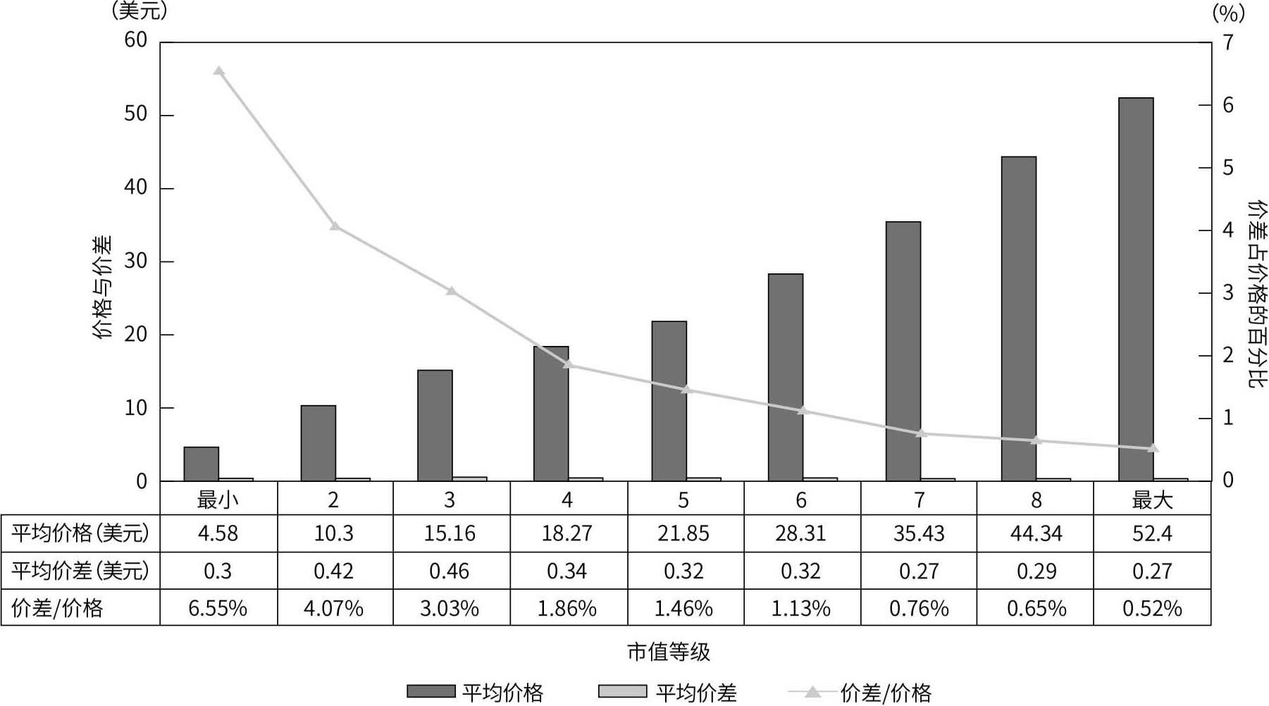 虽然不同市值等级股票在绝对价差上区别不是很大,但规模最小的公司股票价格一般也更低。因此,对小市值股票来说,价差占股票价格的比例为6.55%,而对大市值股票来说,价差只占股票价格的0.52%。