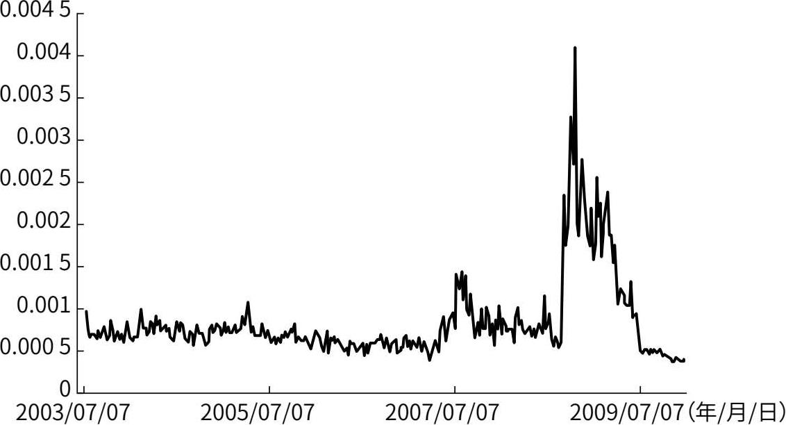 回顾历史,从长期来看,流动性逐步得到改善,从而降低了交易成本。但中间也出现过流动性枯竭、交易成本飙升的时期。表5.1中的每个新兴市场在过去几十年中至少经历过一次交易量大幅下跌、买卖价差显著增大的危机。人们曾经认为,这种剧烈的变动是不会发生在成熟市场的,但2008年的金融危机打破了这种幻觉。2008年9月到12月,美国股票和公司债券市场的买卖价差全面扩大,甚至流动性很好的大盘股的买卖价差也经常达到3倍到4倍。一项研究估算了美国市场上51只投资级大盘股从2003年到2009年的流动性变化,结果如图5.3所示。