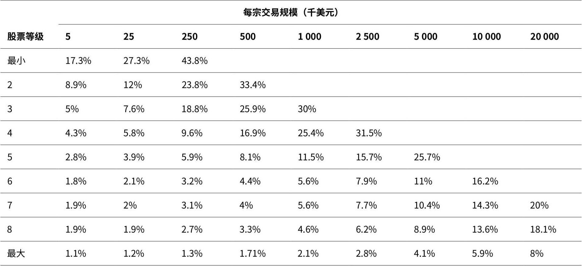 表5.2 作为股票市值和每宗交易规模的函数的换手交易成本