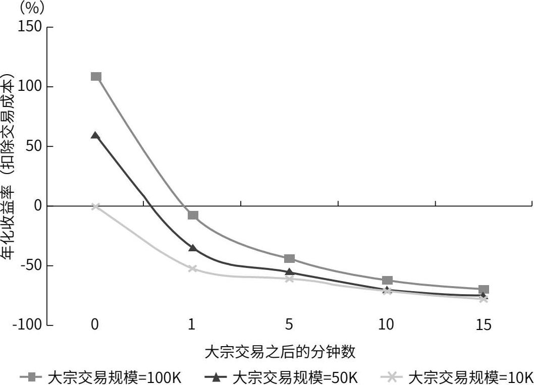 针对证券交易所场内大宗交易的价格影响的研究发现,价格在数分钟内就能完成调整过程。在丹恩、迈耶斯和拉布进行的一项早期研究中,他们通过观察投资者在大宗交易发生时买入股票的行为来测试价格的反应速度。 [14] 他们将大宗交易发生后投资者买入股票所获的收益作为大宗交易到投资者跟随买入之间的分钟数的函数,发现只有在大宗交易完成后几分钟内进行的买入交易才有可能创造超额收益(如图5.4所示)。换句话说,价格在大宗交易发生后的5分钟内就完成了调整,这有力地证明了市场具有快速调节供需平衡的能力。