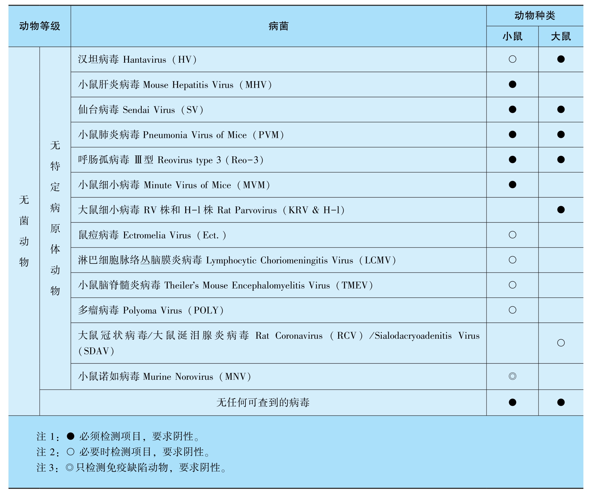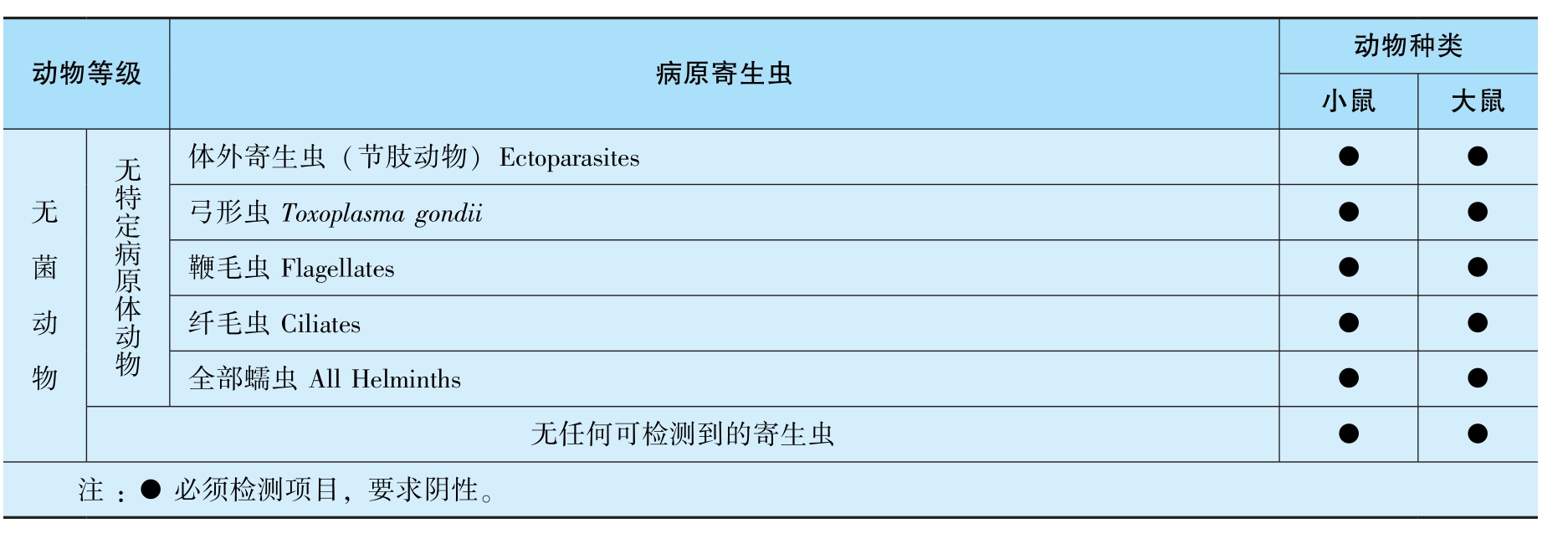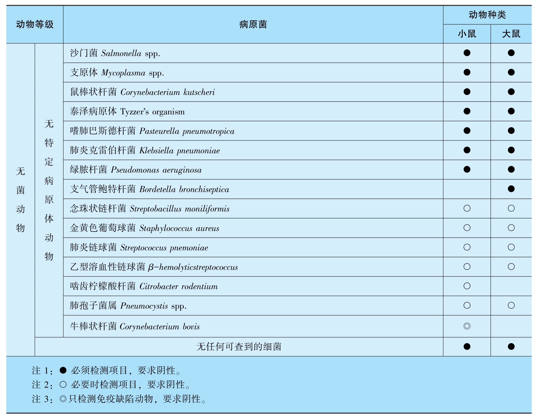 根据原国家质量监督检验检疫总局制定的有关微生物、寄生虫的控制标准(GB149 22-2022),不同等级实验动物要求排除的细菌、病毒、体外寄生虫的种类见表3-2~表3-10。