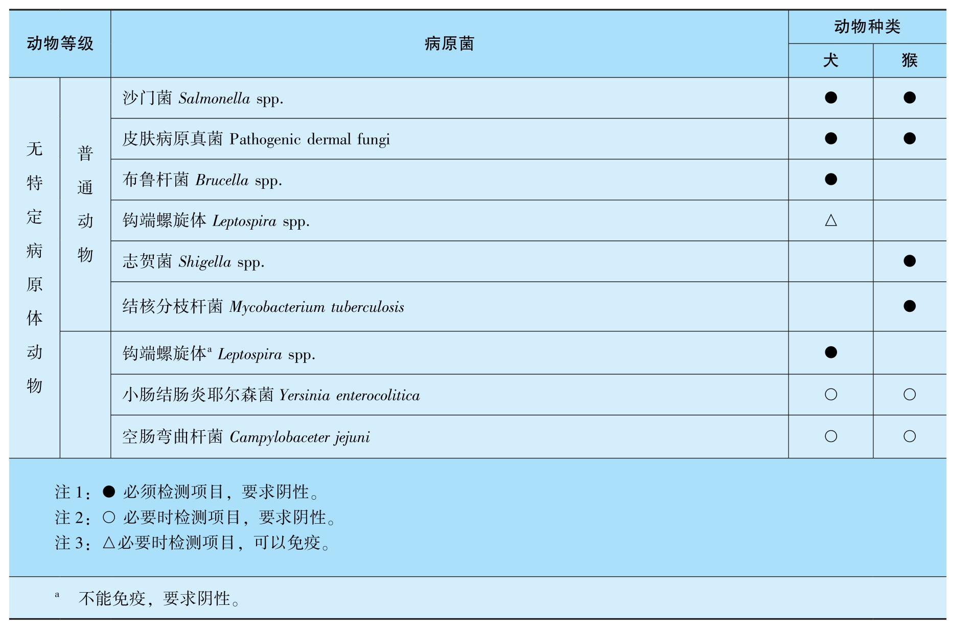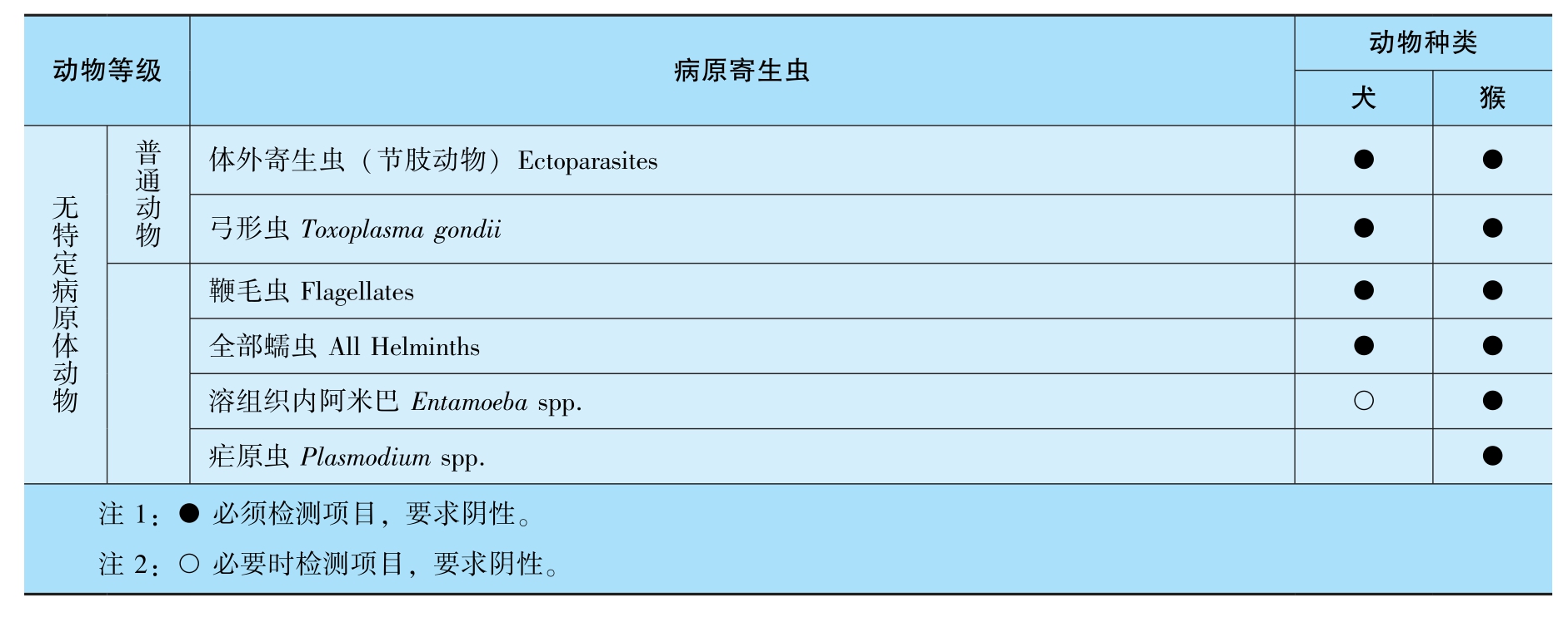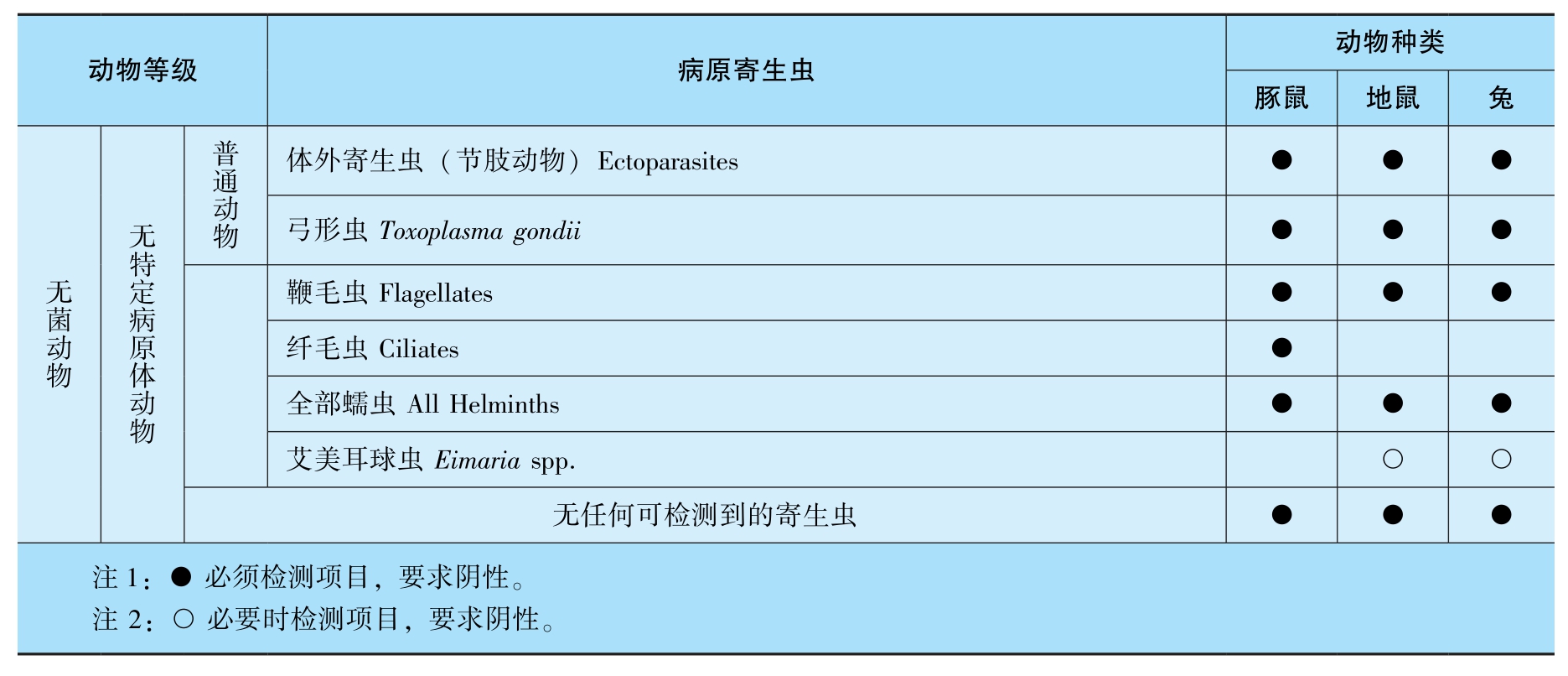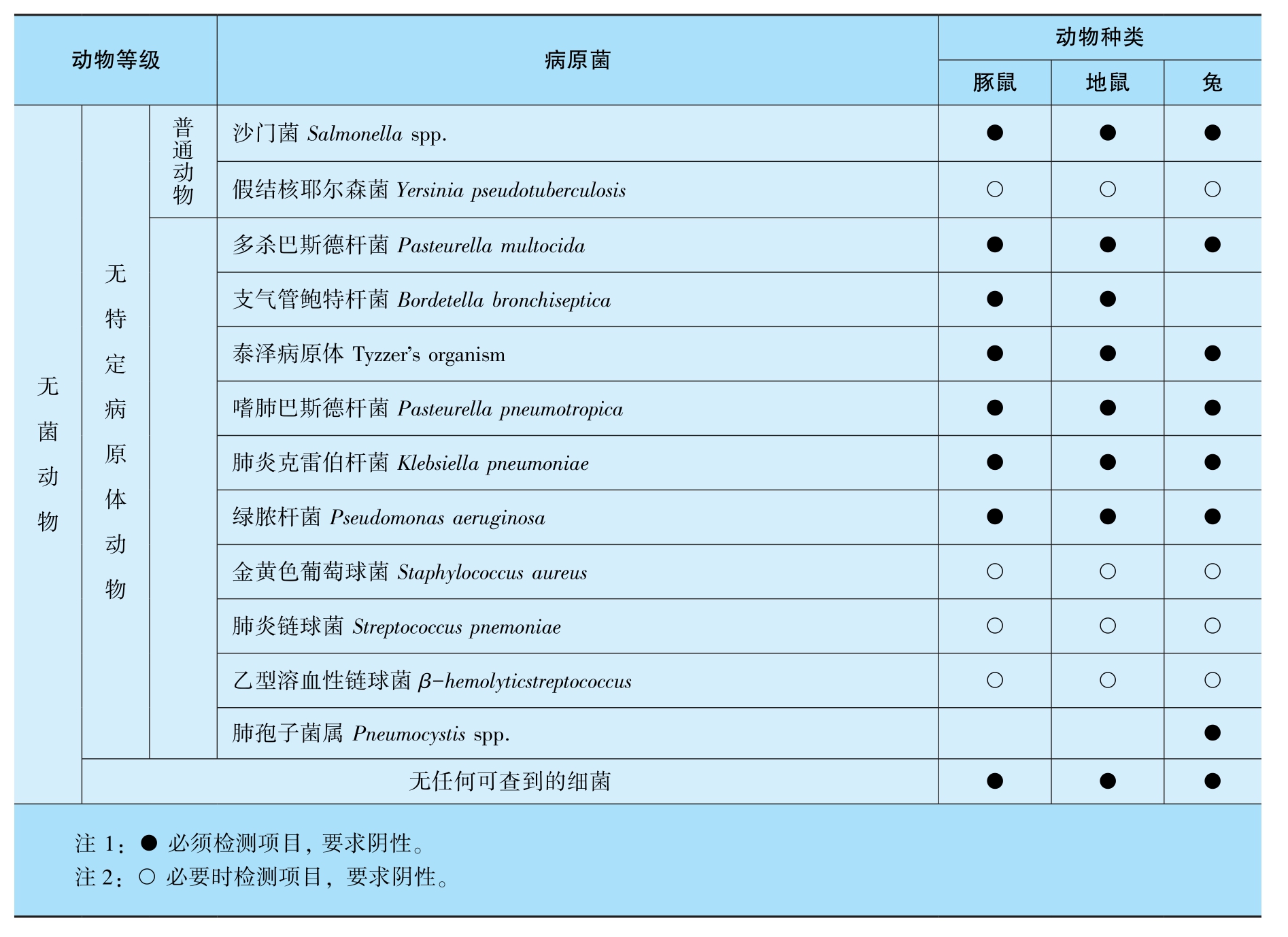 根据原国家质量监督检验检疫总局制定的有关微生物、寄生虫的控制标准(GB149 22-2022),不同等级实验动物要求排除的细菌、病毒、体外寄生虫的种类见表3-2~表3-10。