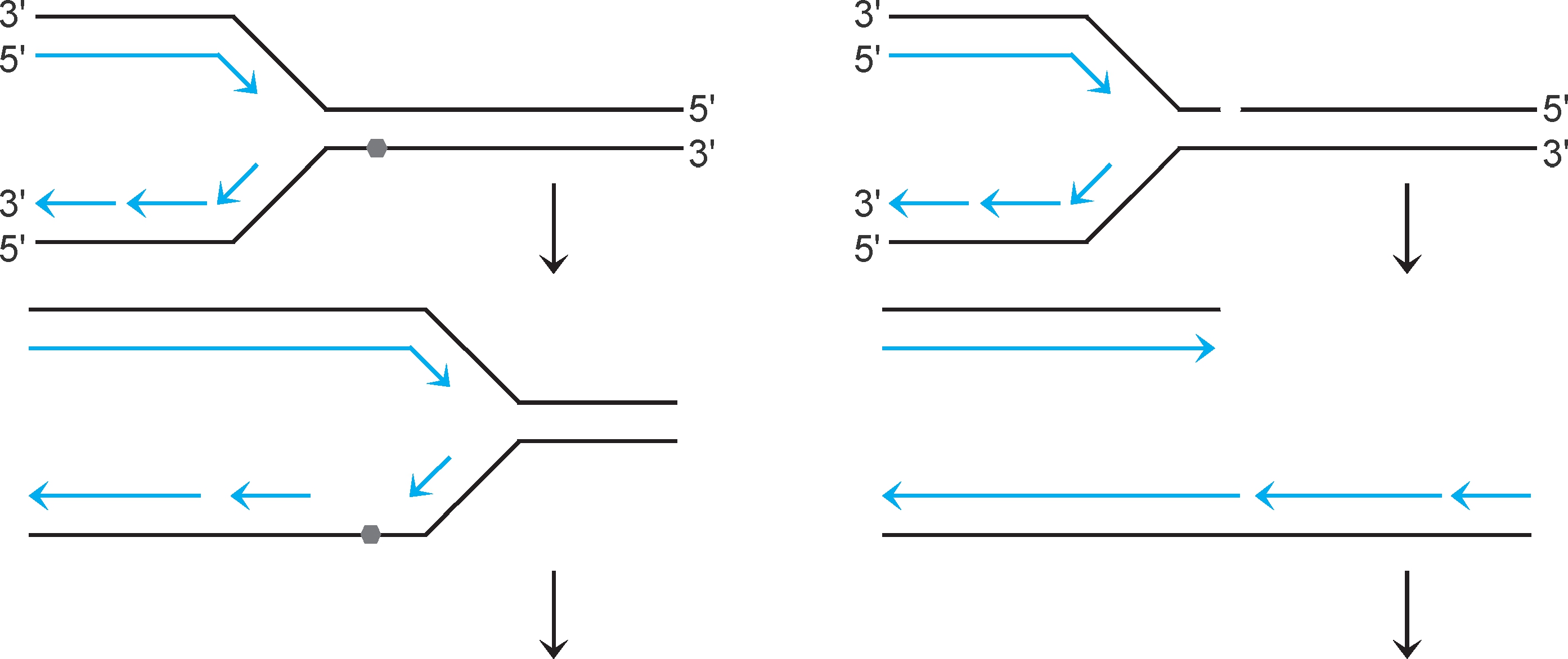 重组修复 (recombinational repair)系统可修复以下损伤:①复制进行至模板损伤(如嘧啶二聚体)部位时,复制体不能根据碱基配对原则合成新生链,会越过损伤继续复制,新生链对应模板损伤部位留下缺口(图2-36左)。②复制进行至模板切口或断裂位点时,复制体解体(collapse),复制叉一臂成为双链断裂末端(图2-37右)。两种损伤各由特定修复系统修复。