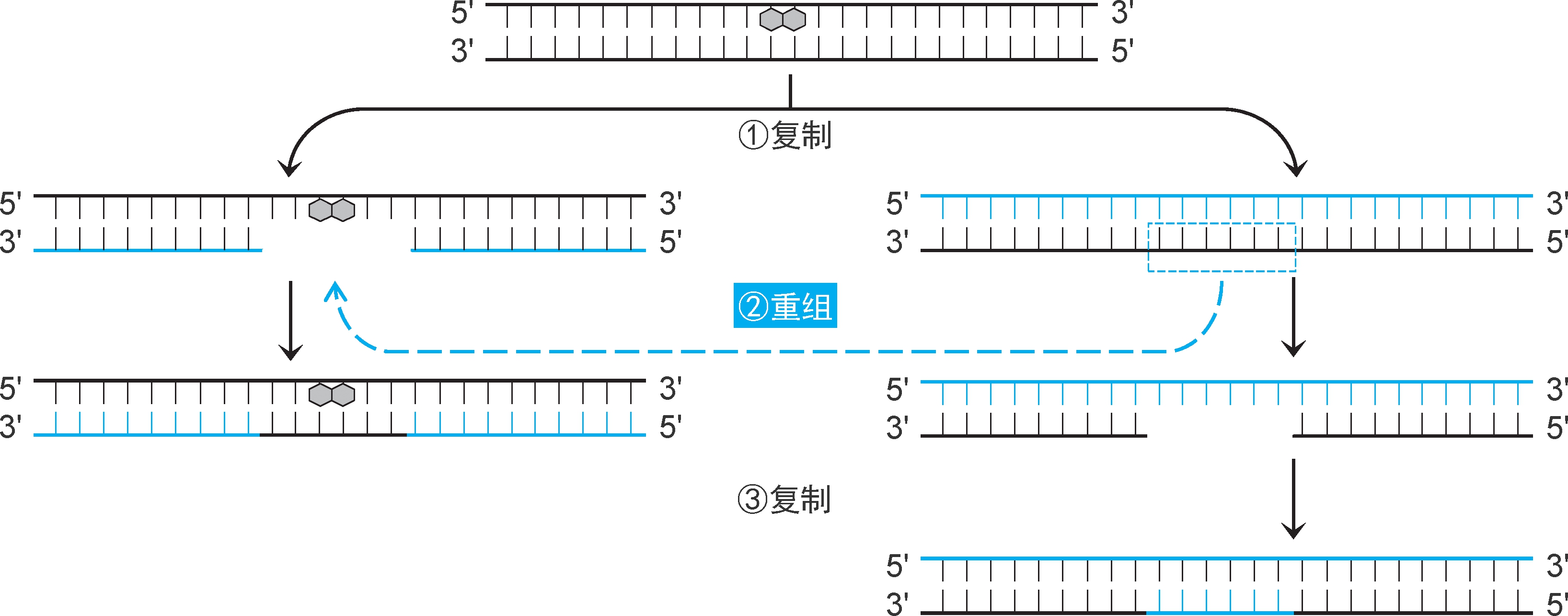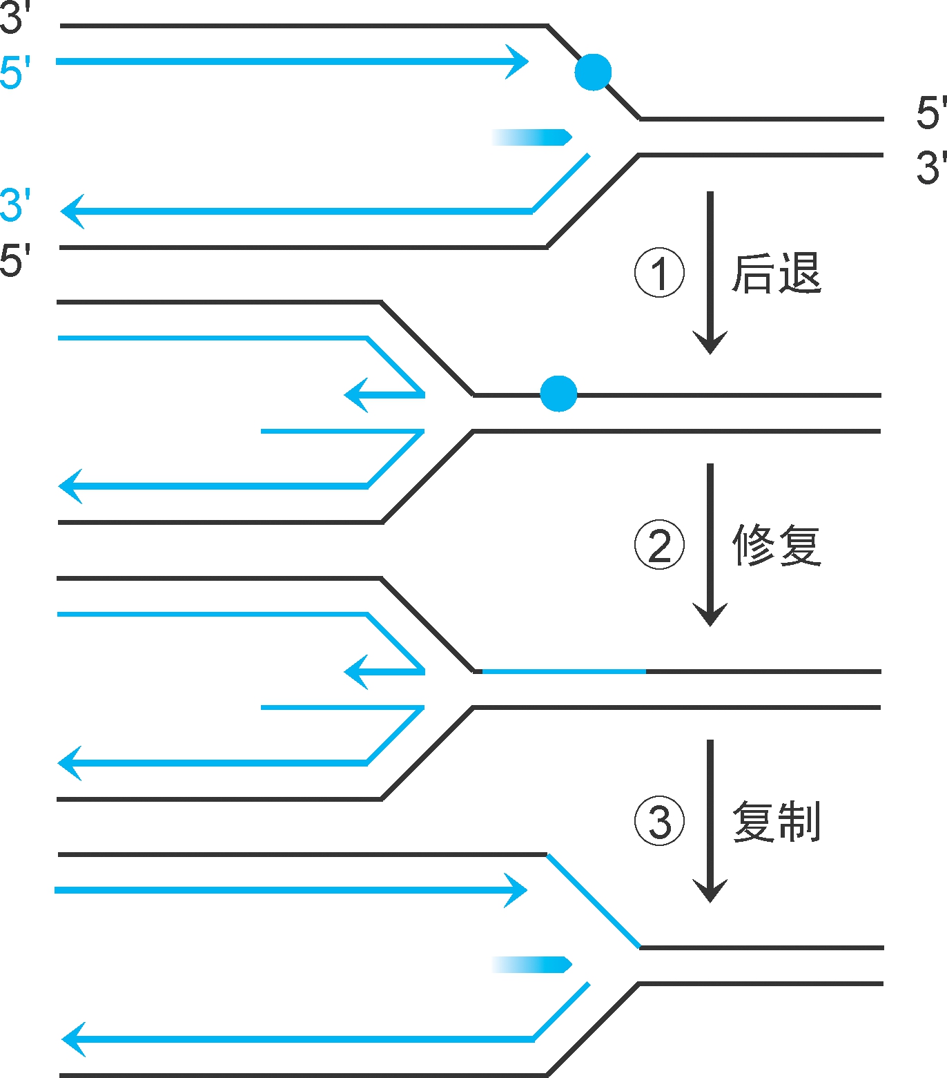 重组酶RecA和核酸外切酶Ⅴ还可在缺口形成前催化模板修复(图2-38):复制在损伤位点中止,复制体解体。①复制叉后退,前导链和后随链形成双链。②模板损伤进行切除修复。③复制叉恢复推进,复制体再形成,复制重启。此修复过程需要RecA稳定DNA单链,RecB、RecC参与切除修复,有时会有重组发生(图中未示)。