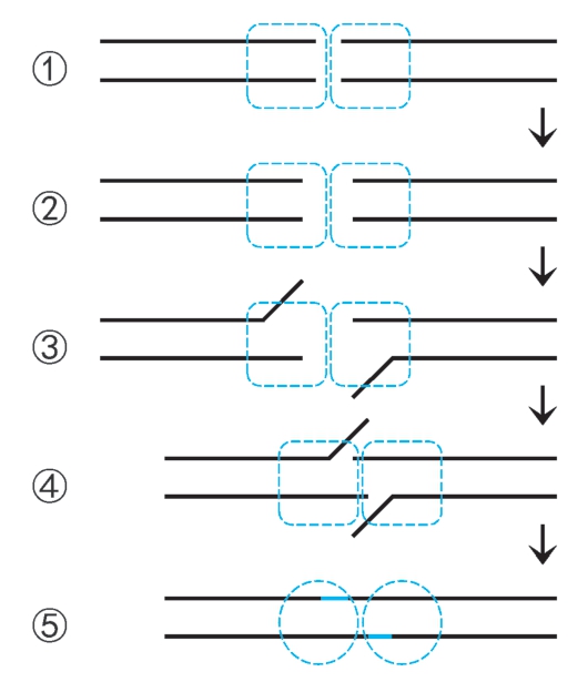 2.双链断裂修复 包括同源重组修复和非同源末端连接。同源重组修复是酵母双链断裂的主要修复机制(图2-41,66页)。 非同源末端连接 (nonhomologous end joining,NHEJ)是将断裂末端经过适当加工重新连接,由J. Moore和J. Haber于1996年报道,是高等生物双链断裂的主要修复途径,机制如下:①断裂末端募集DNA修复蛋白XRCC6-XRCC5(Ku70-Ku80)二聚体(解旋酶Ⅱ),进而募集DNA-PK催化亚基形成DNA-PK复合体,募集5'→3'外切酶Artemis,形成断裂末端复合体,并二聚化。② 断裂末端复合体中DNA-PK催化Artemis磷酸化激活,呈现5'→3'内切酶活性。末端部分水解。③XRCC6-XRCC5催化断裂末端解链。④末端间单链局部退火。⑤Artemis切去游离末端,缺口由Pol μ或Pol λ催化合成填补,切口由DNA连接酶Ⅳ催化封闭(图2-39)。