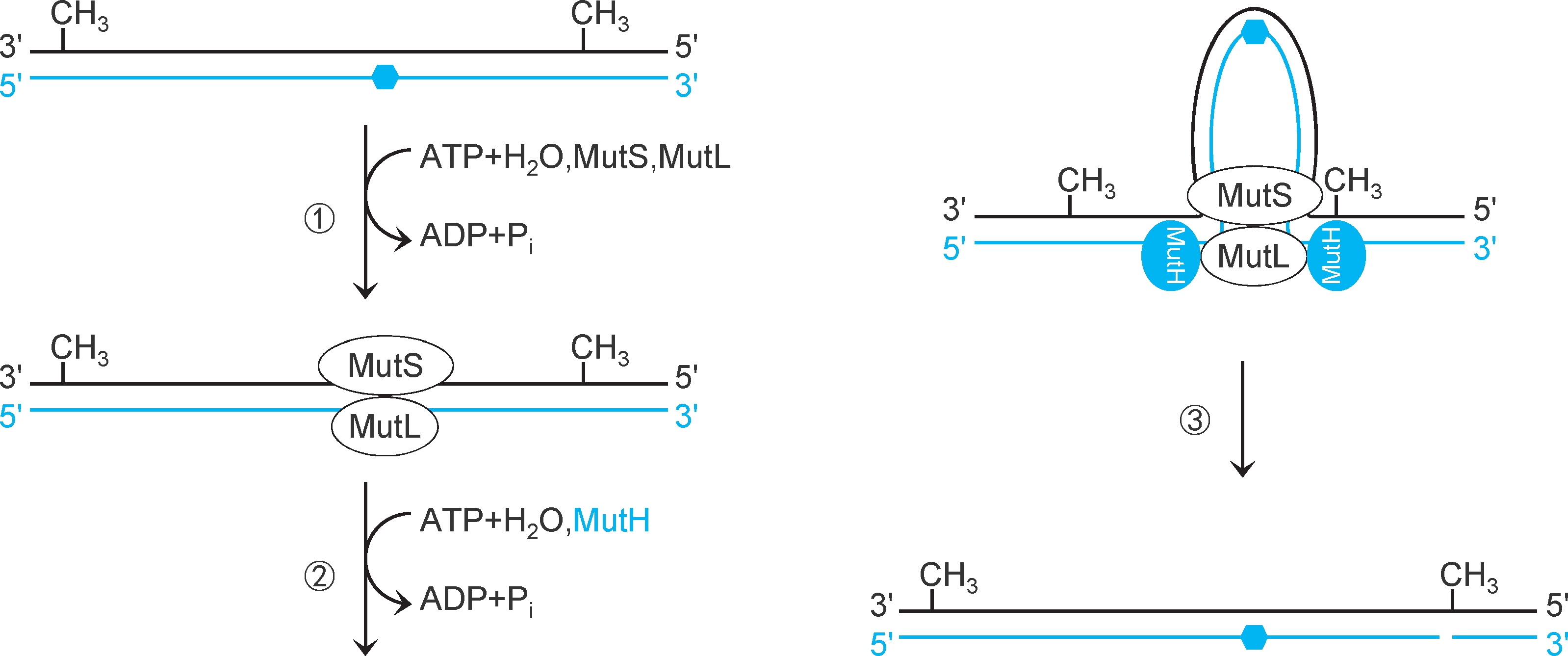 真核生物错配修复系统有几种错配修复蛋白的结构和功能与细菌MutS、MutL类似,从酵母到人,真核生物最重要的MutS同源蛋白是MSH2、MSH3、MSH6。MSH2-MSH6异二聚体主要识别并结合单一错配碱基对,对较长错配结合力较弱。较长错配(2~6bp)由MSH2-MSH3识别并结合,或由两种二聚体串联识别并结合。MutL同源蛋白主要是MLH1-PMS1异二聚体,与MSH复合物结合并稳定之。真核生物新生链识别机制尚未阐明,但已明确与GATC序列无关。修复机制则与大肠杆菌类似。真核生物错配修复系统还可修复复制滑动导致的插入缺失,需要DNA聚合酶δ参与。人体这几种错配修复蛋白基因突变与某些常见的遗传性肿瘤易感综合征相关,进一步佐证了DNA修复系统的重要性。