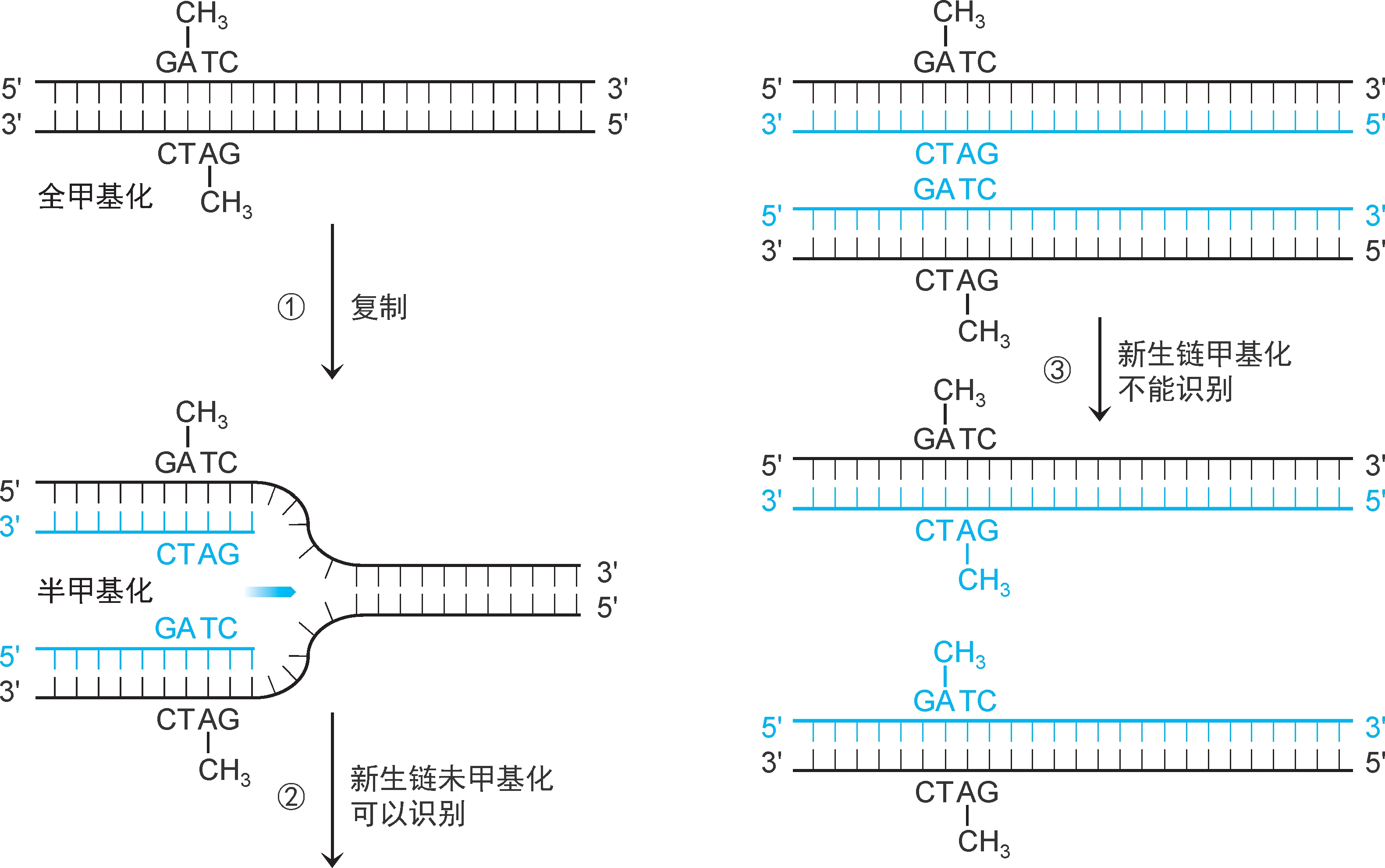 错配修复要求子代DNA的GATC处于半甲基化状态,这一状态只能维持几秒至几分钟,之后将被甲基化为全甲基化状态。甲基化由大肠杆菌 Dam甲基化酶 催化(图2-31)。