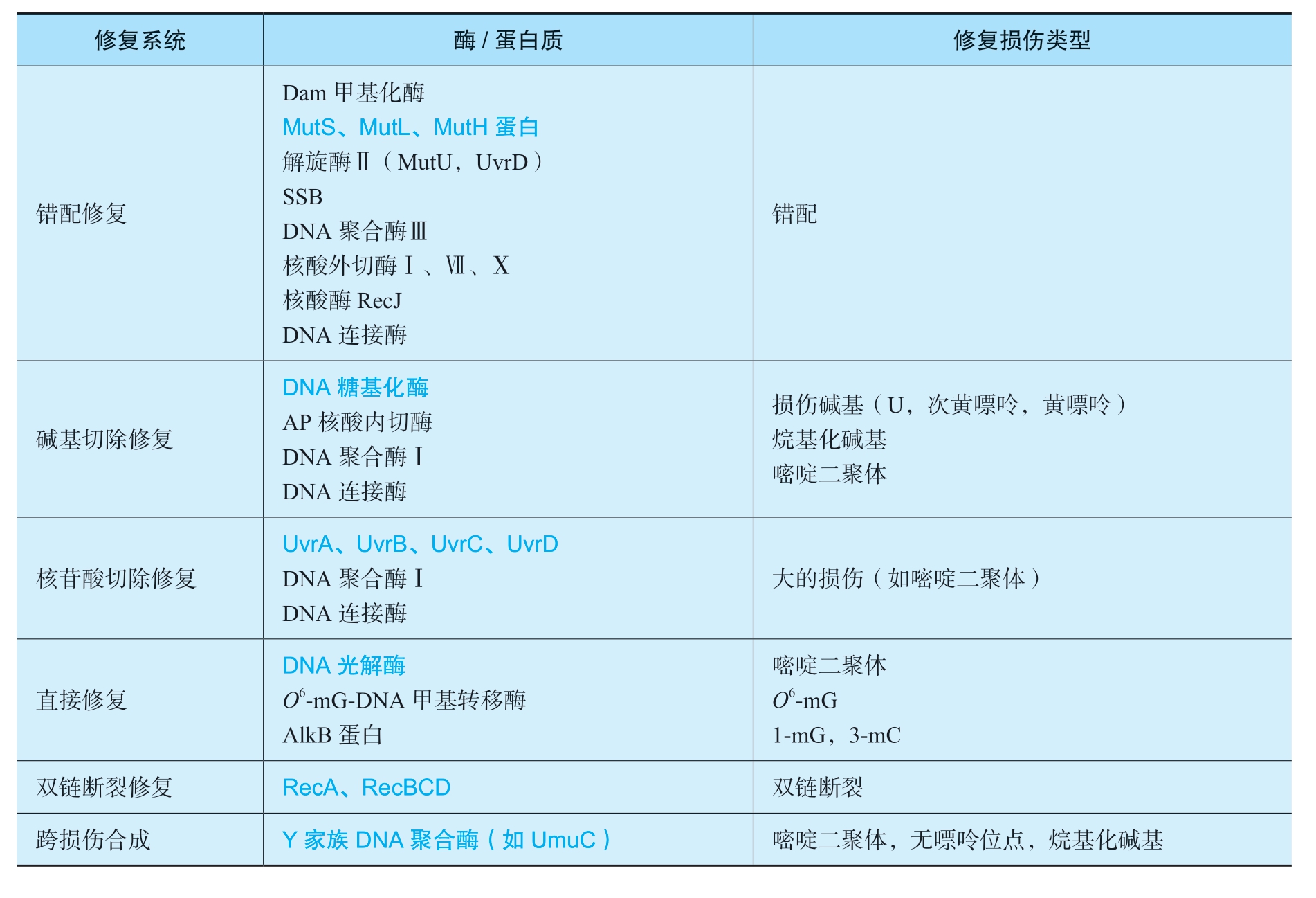 DNA聚合酶的校对功能可保证DNA复制的保真性,对遗传信息在细胞增殖时的准确传递至关重要。DNA复制虽然极少出错但并非万无一失。此外,即使在非复制期间,DNA也会发生损伤,导致DNA的序列或结构出现异常,甚至发生基因突变。这种突变会影响表型,一方面是生物进化的基础,另一方面又是个体患病甚至死亡的遗传因素。不过,在漫长的进化过程中,生物体已经建立了一组修复系统,可以修复各种DNA损伤,以保证生命的延续性和遗传的稳定性。