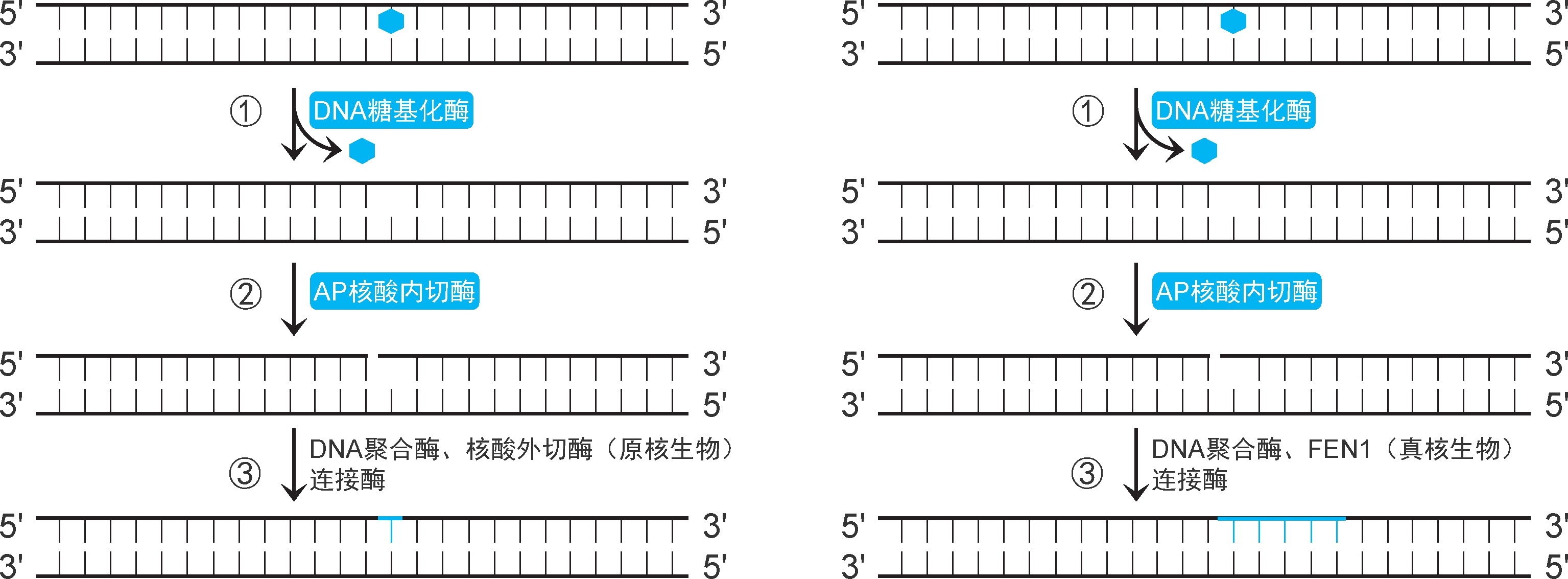 (1)大肠杆菌碱基切除修复机制:大肠杆菌碱基切除修复酶系包括五类酶。① DNA糖基化酶 (DNA glycosylase,DNA糖苷酶,DNA glycosidase):有几十种,每一种都特异识别并水解一种损伤碱基形成的糖苷键,释放损伤碱基,形成AP位点。可分为单功能糖基化酶(催化水解释放损伤碱基,形成AP位点)和双功能糖基化酶(除催化释放损伤碱基形成AP位点外,还有AP裂解酶活性)。② AP核酸内切酶 (AP endonuclease,AP裂合酶):有十几种,不同AP核酸内切酶催化机制及专一性不同。可分为水解酶(催化AP位点上游磷酸酯键水解,形成3'端为羟基、5'端为5'-磷酸脱氧核糖的切口)和裂解酶(催化AP位点下游磷酸酯键裂解——β消除,形成3'端为去饱和醛、5'端为5'-磷酸脱氧核苷酸的切口)。③ 核酸外切酶 :催化脱去5'-磷酸脱氧核苷酸,如RecJ。④DNA聚合酶Ⅰ:催化加接一个脱氧核苷酸(图2-35左)。在无核酸外切酶时,可通过切口平移合成一段寡脱氧核苷酸(有时简称寡核苷酸)(图2-35右)。⑤DNA连接酶。
