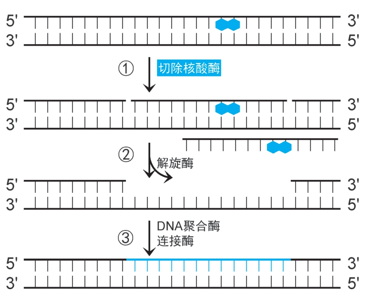 切除修复 (excision repair)是指切除双链DNA的单链损伤,然后以正常互补链为模板,合成DNA填补缺口,将其修复。切除修复是细胞内最普遍的修复机制。原核生物和真核生物都有核苷酸切除修复系统和碱基切除修复系统,且均以核苷酸切除修复系统为主。两套系统都包括两个步骤:①由特异性核酸酶寻找损伤部位,切除损伤片段。②合成DNA填补缺口。