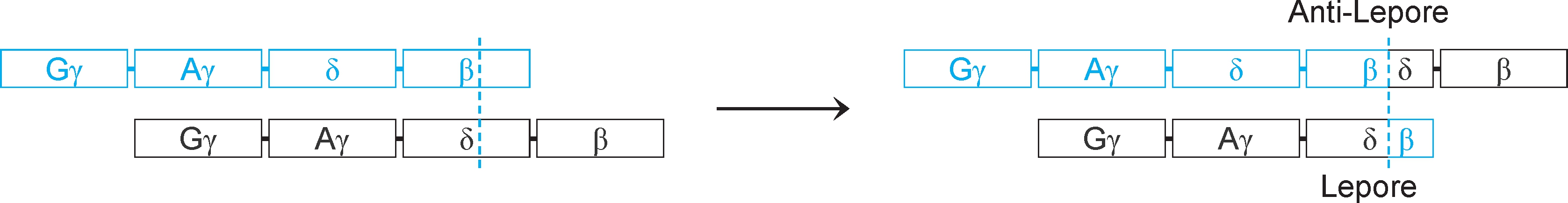 3.重排(rearrangement) 又称基因重排、DNA重排、 染色体易位 (chromosomal translocation),是指基因组中较大DNA片段(10~1000bp)移动位置,但不包括基因组DNA缺失或外源DNA插入。重排可发生在DNA分子内部(染色体内),也可发生在DNA分子之间(染色体间),例如血红蛋白Lepore病就是重排的结果(图2-29)。