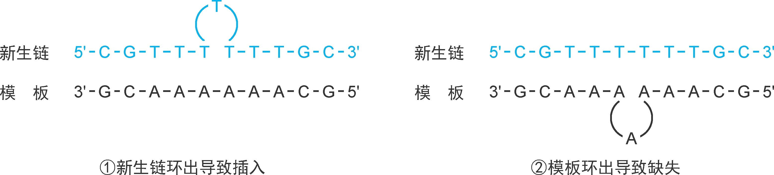 DNA复制时,由于DNA聚合酶偶尔“打滑”(slippage, 复制滑动 、 复制滑移 ),模板或新生链会发生核苷酸的“环出”现象。新生链环出会导致子二代DNA发生插入,而模板环出会导致子二代DNA发生缺失。发生复制滑动的主要位点是重复序列,特别是短重复序列(图2-30)。例如,结肠癌TGF-β受体RⅡ常见一种突变,其基因序列中存在一段由10个连续的腺苷酸组成的短重复序列(A 10 )。在复制时,由于DNA聚合酶滑动,子代DNA中的该短重复序列长度会改变至A 9 或A 11 。