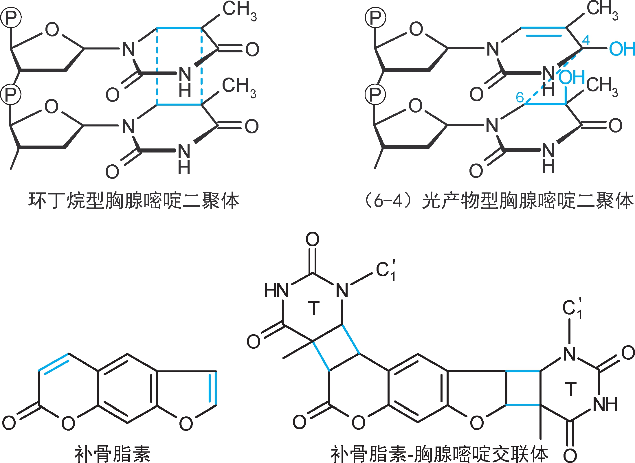 4.共价交联 是指碱基之间形成共价键连接。例如,①同一股DNA链上相邻的胸腺嘧啶发生共价交联(链内交联),形成胸腺嘧啶二聚体,会抑制复制和转录。②补骨脂素类(psoralen)可在双链之间形成交联(链间交联),会抑制复制和转录。